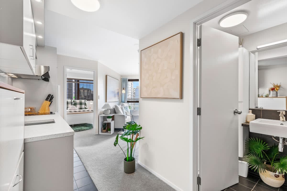 You'll also enjoy a spotless, modern bathroom featuring clean lines and a pristine finish—perfect for refreshing after a day out in the city.