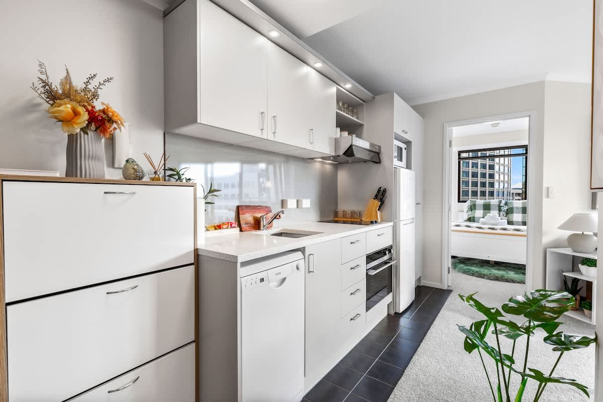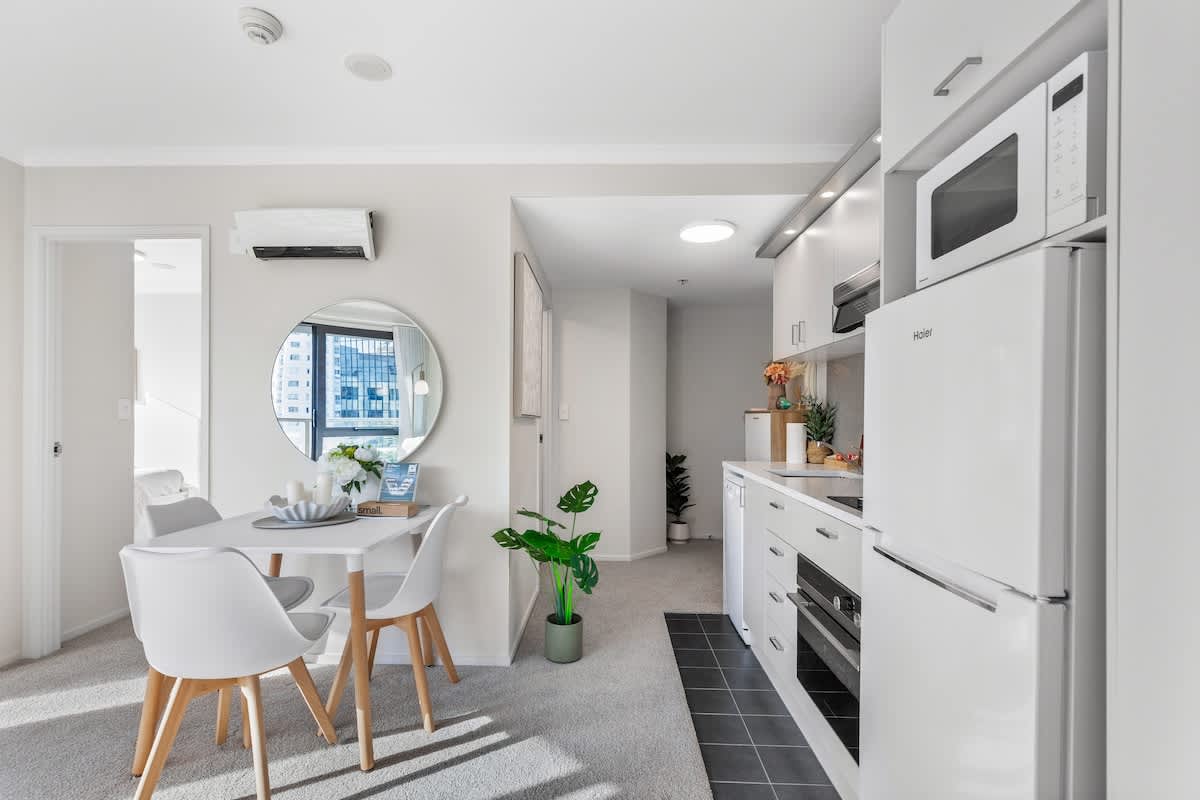The apartment features a modern, open-concept kitchen and dining area filled with natural light. The sleek, white kitchen is fully equipped with essential appliances, including a fridge, oven, stovetop, microwave, and dishwasher—perfect for preparing meals during your stay. The dining area features a stylish three-seater table, ideal for enjoying a meal.