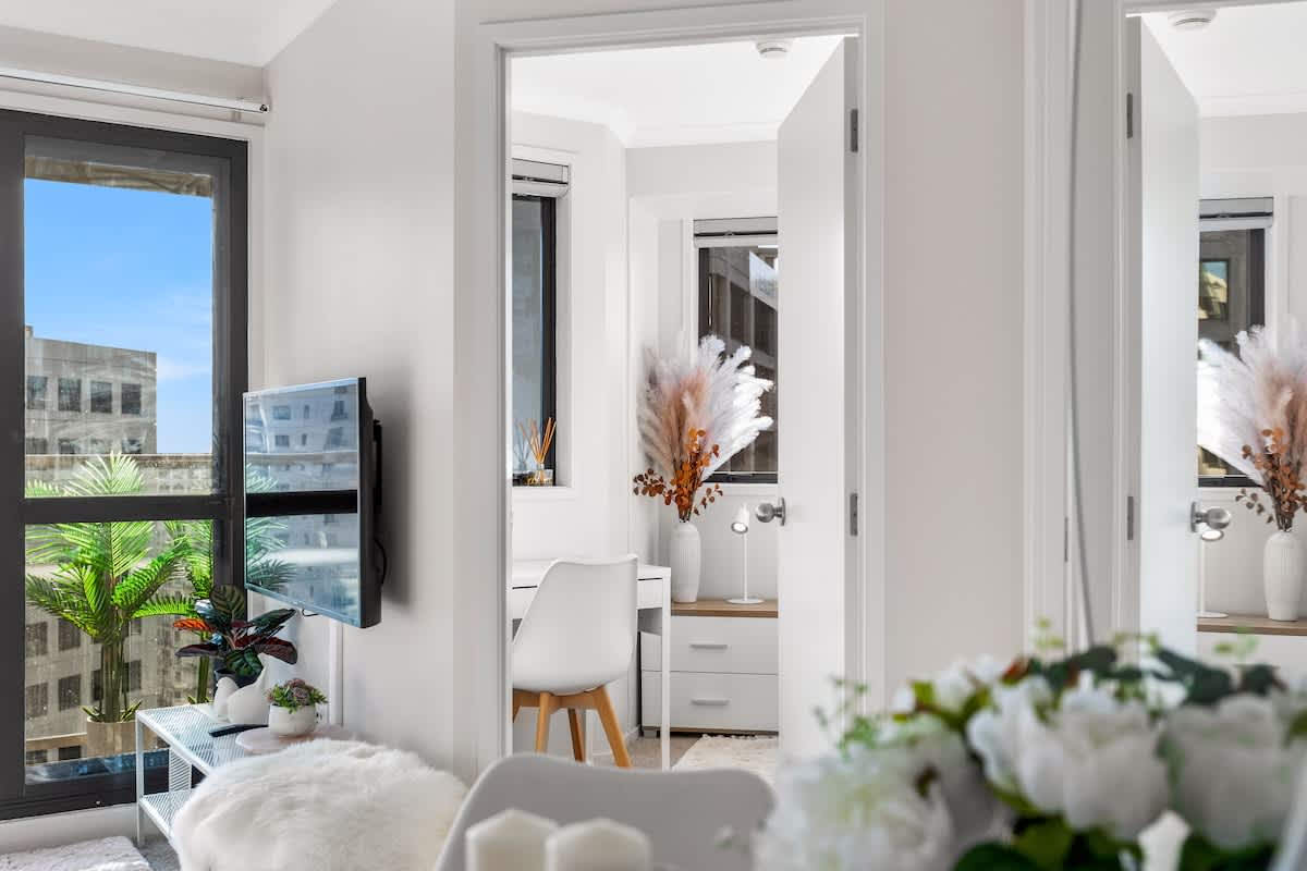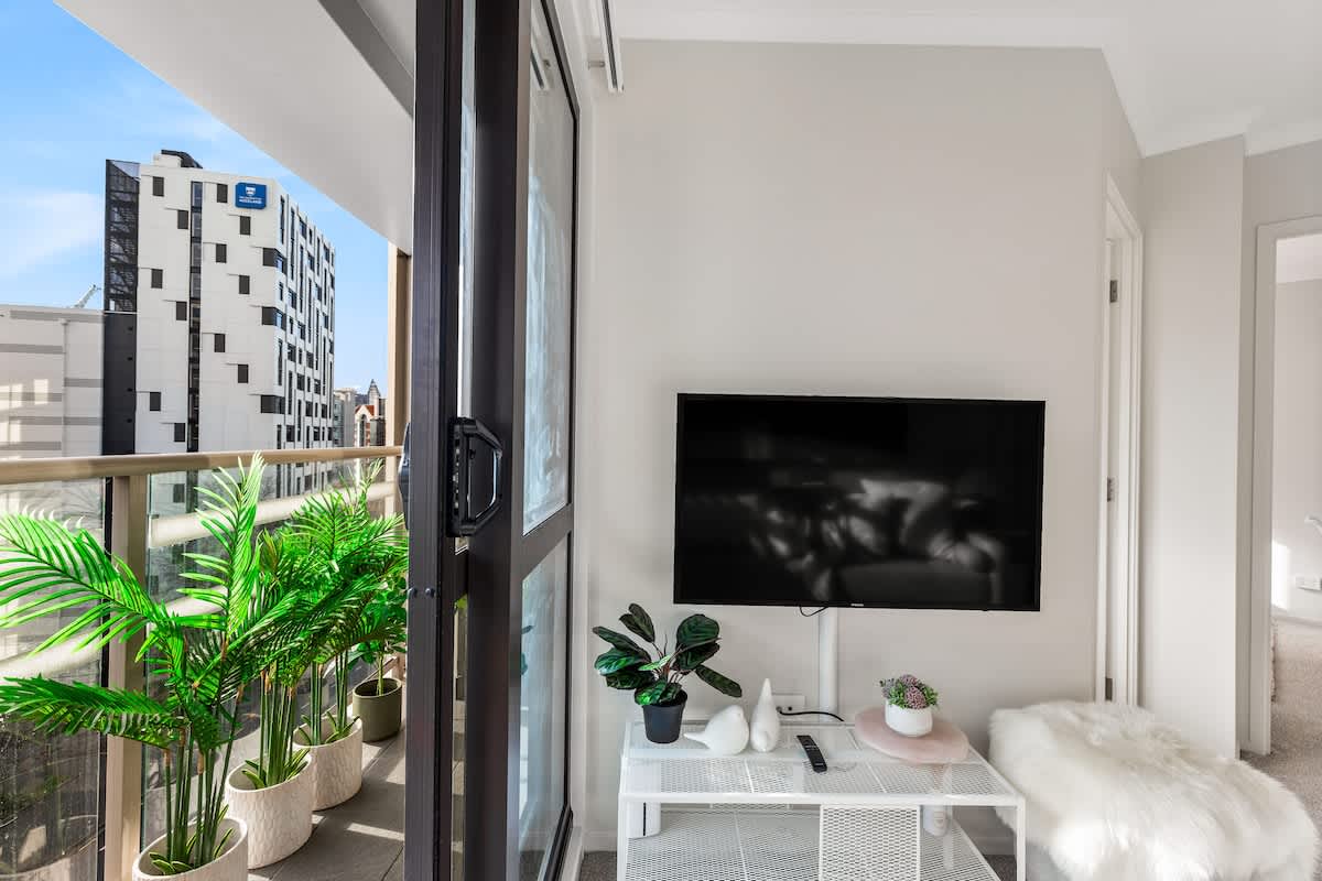 The living area is designed for relaxation and comfort, featuring a plush, cozy couch where you can unwind after a day of exploring the city. A smart TV is mounted for your entertainment needs—perfect for streaming your favorite shows or enjoying a quiet movie night. The space opens out to a private balcony, offering fresh air and lovely views of the city skyline.