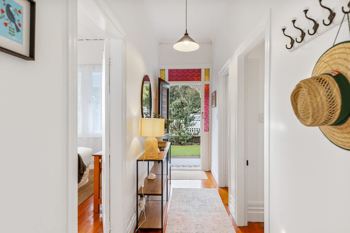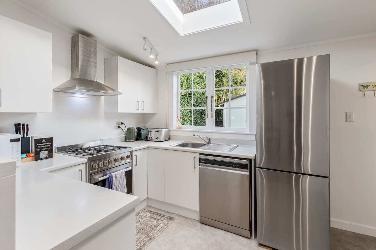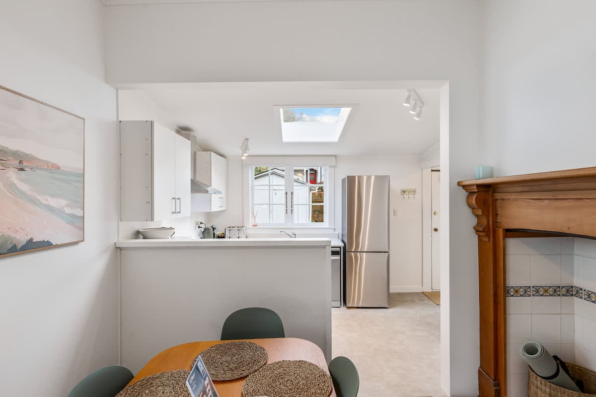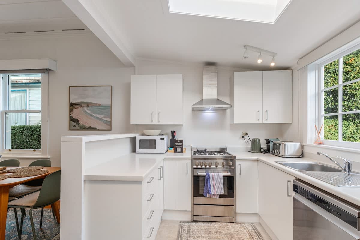 The fully equipped kitchen has everything you need for easy meals at home, including a stove, coffee maker, dishwasher, and full-size fridge. Beautifully styled throughout, the home blends thoughtful modern touches with a relaxed boutique feel, while its classic villa details showcase the timeless charm and character that make Auckland so special.