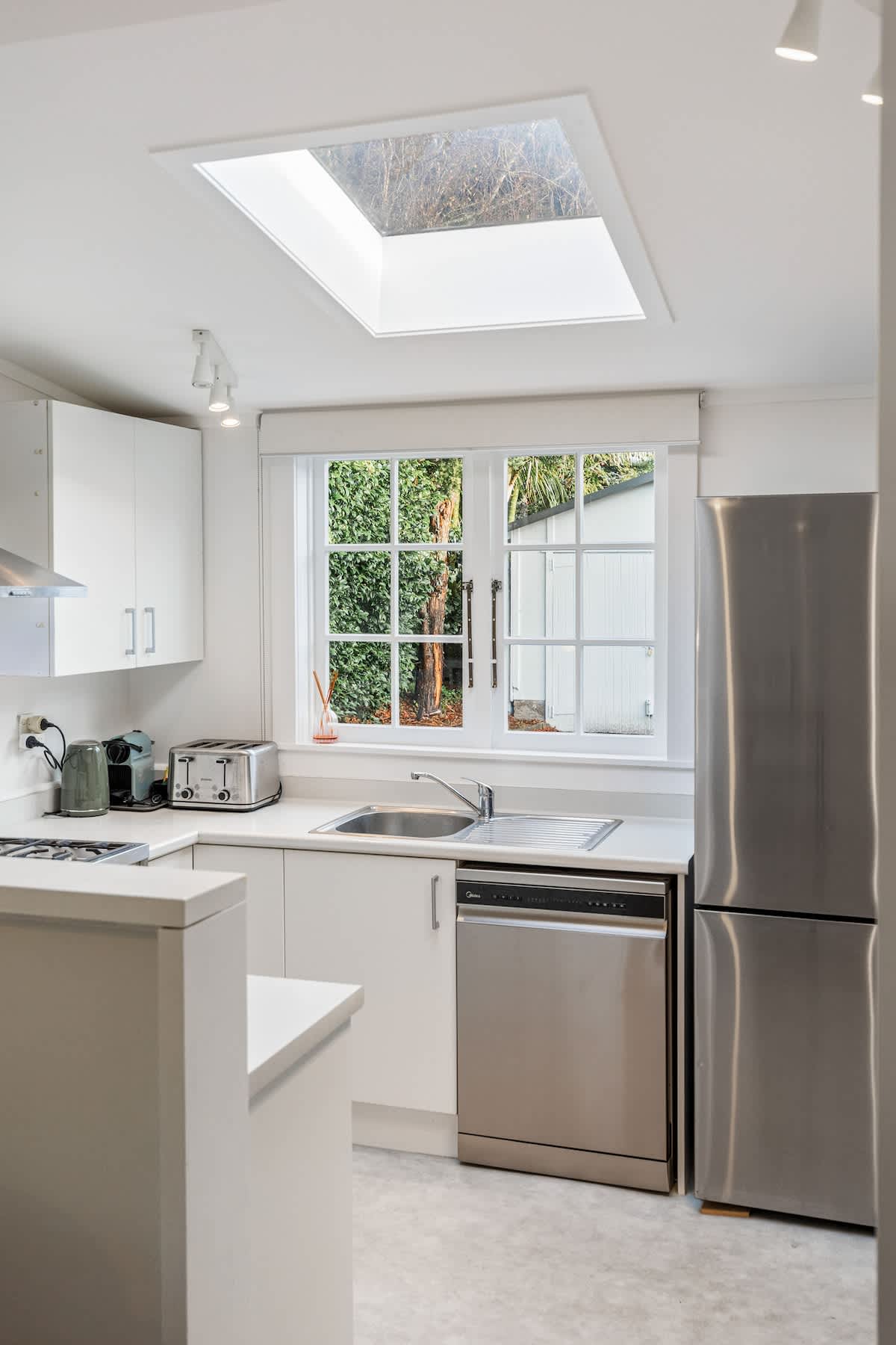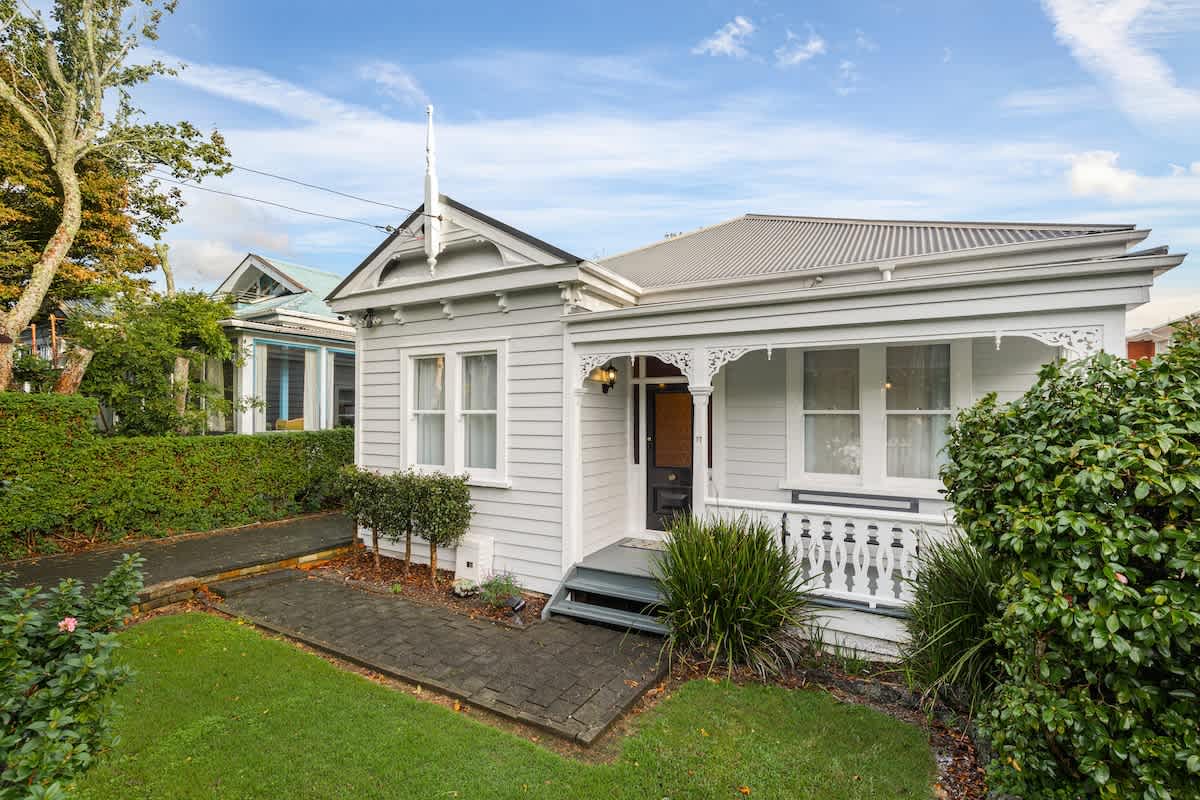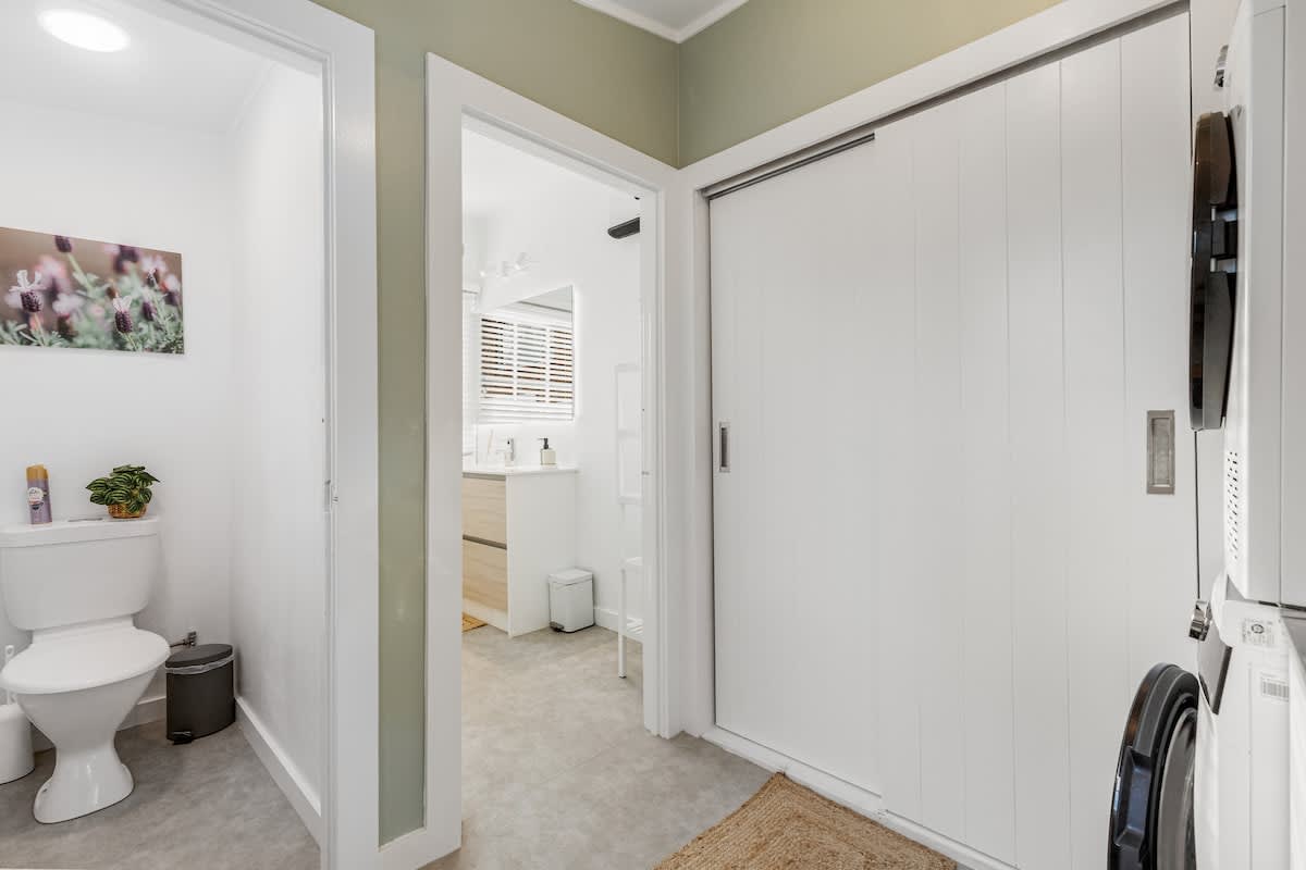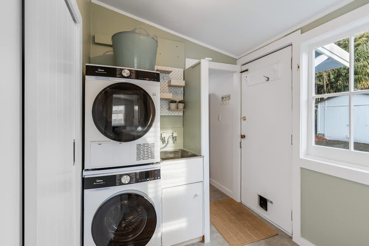 The fully equipped kitchen has everything you need for easy meals at home, including a stove, coffee maker, dishwasher, and full-size fridge. Beautifully styled throughout, the home blends thoughtful modern touches with a relaxed boutique feel, while its classic villa details showcase the timeless charm and character that make Auckland so special.