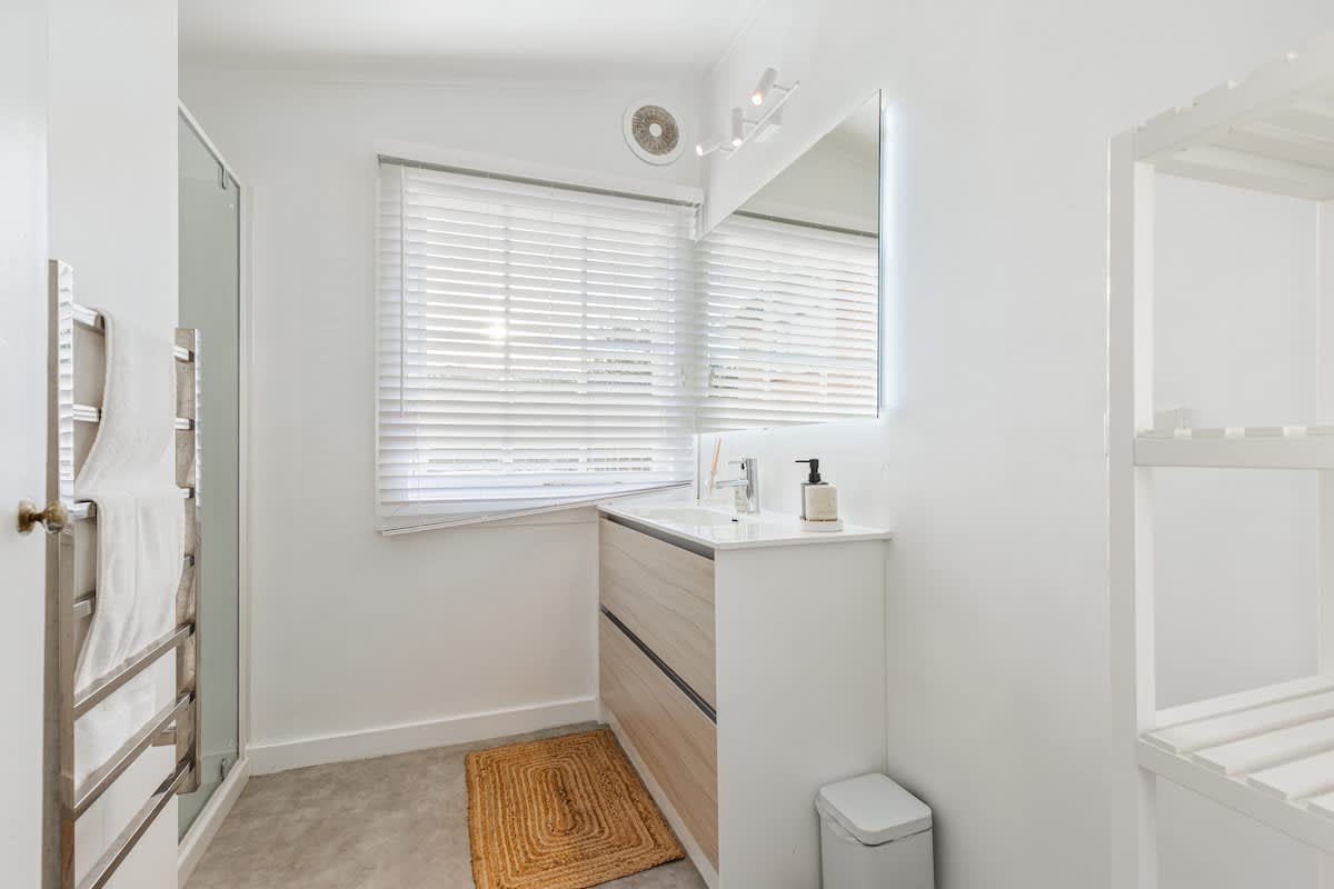 The home offers three inviting bedrooms, each thoughtfully styled for a restful and comfortable stay. Every room features a cosy, comfortable bed dressed in fresh, crisp linens and complemented by soft, fluffy pillows to ensure a relaxing night’s sleep.