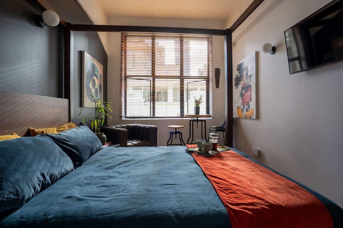 Large New York-style windows flood the space with natural light, creating a bright and airy atmosphere. For dining, a table with two chairs offers a cosy spot to enjoy meals. For entertainment, the apartment has a smart TV mounted to the wall and comes stocked with a variety of reading materials located in the loft.