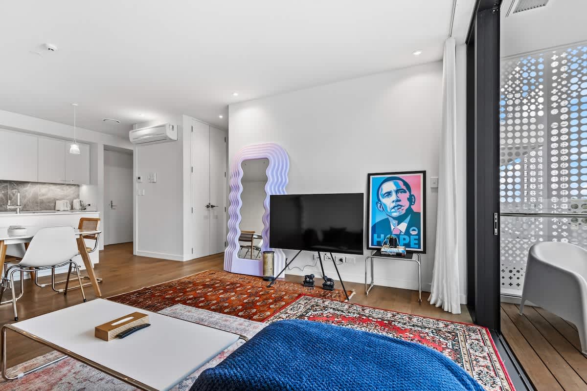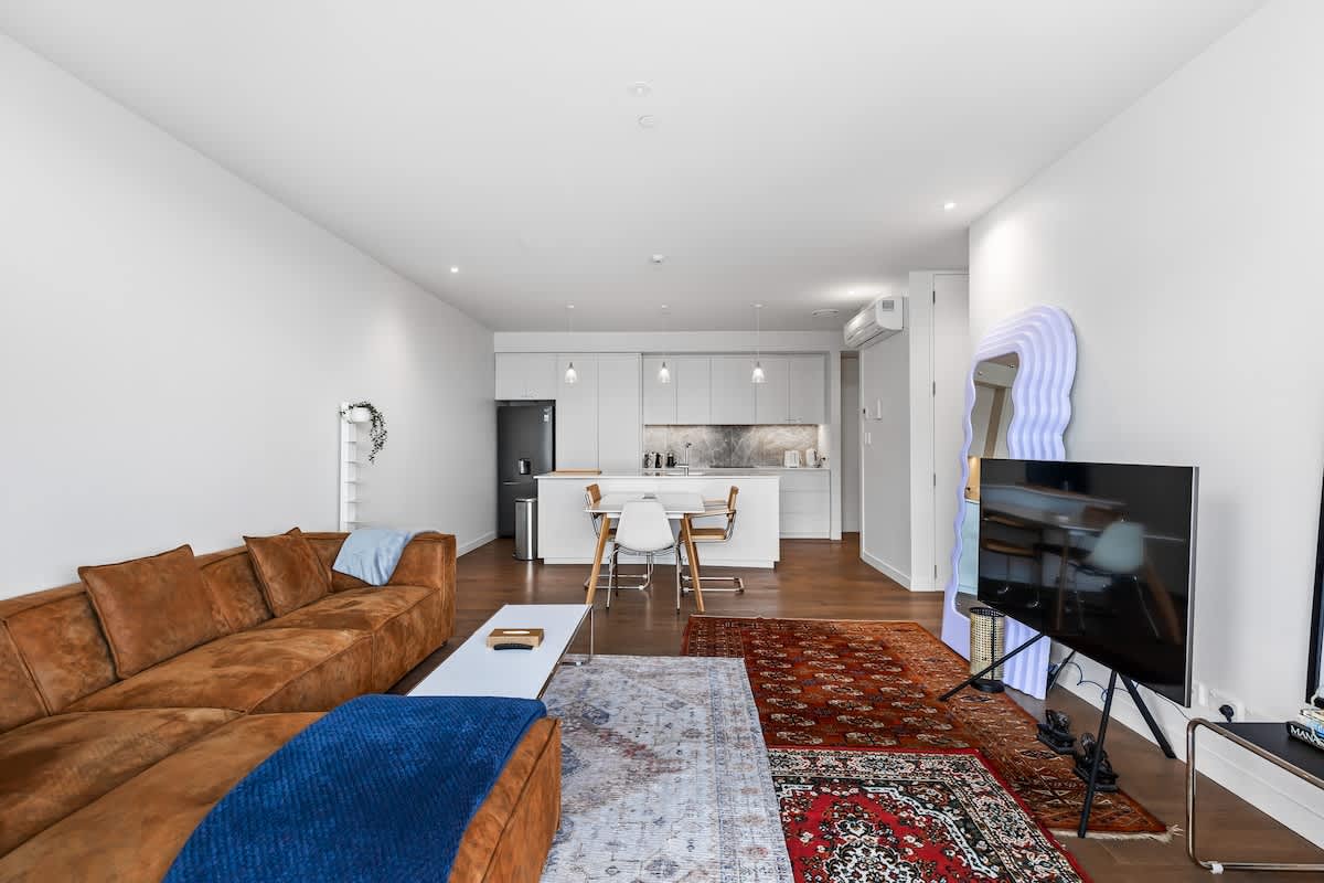 The apartment has a bright, open living space with a comfy lounge area, smart TV, and access to a private balcony. The kitchen comes fully equipped with full-sized appliances, so whether you’re cooking dinner or just making breakfast, you’ll have everything you need.