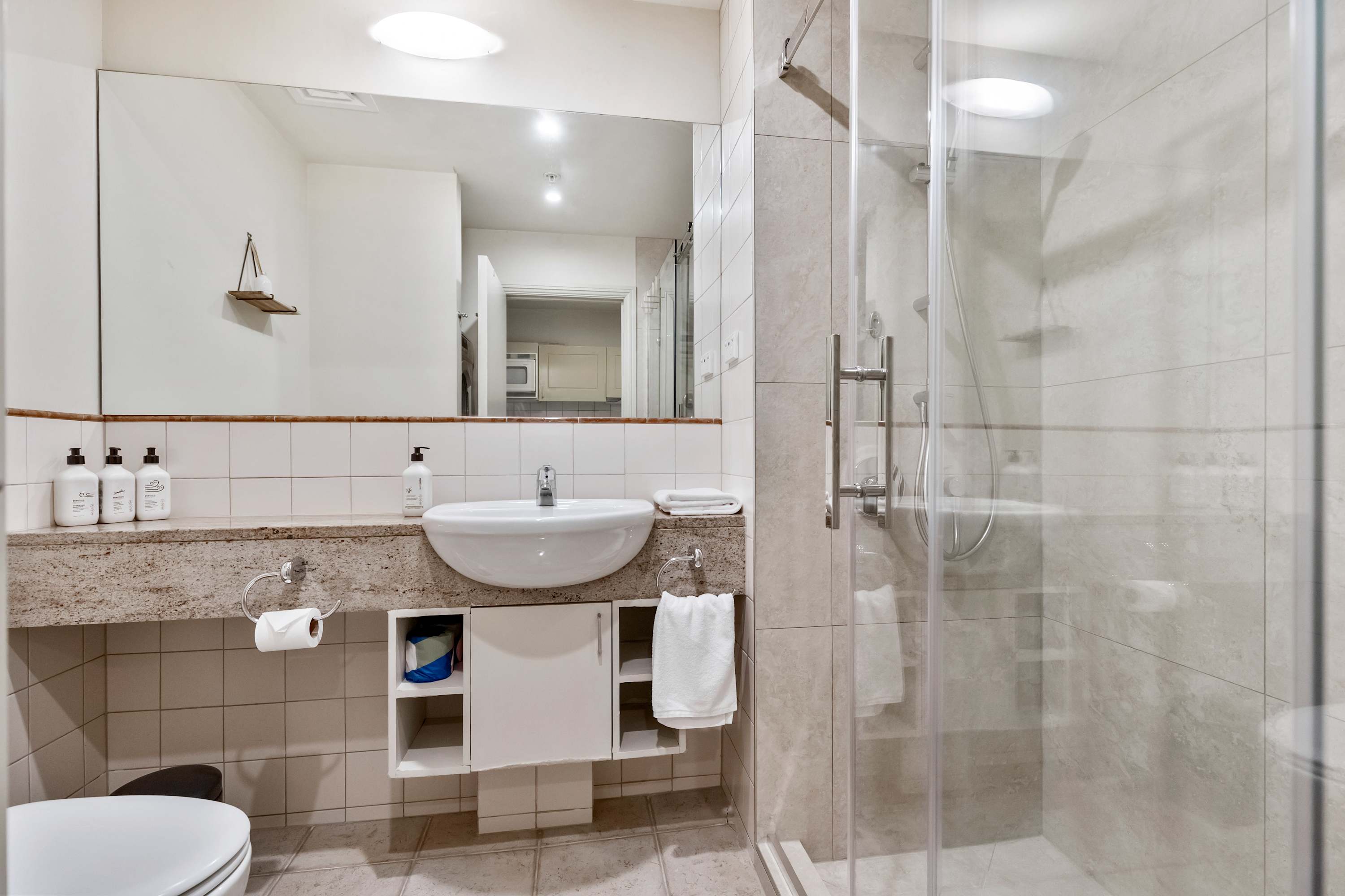 Amenities: We provide a starter pack of amenities to last you the first few days of your stay 450ml shampoo and conditioner, 450ml bodywash, 4 x tea/coffee, 3 x toilet paper rolls, 1 pack of laundry powder, 1 pack of dishwashing powder, dishwashing liquid, cleaning spray and wipes) but you will need to purchase your own amenities after these run out. Please do not take the large refillable bottles provided as we’ll need to charge for replacement.