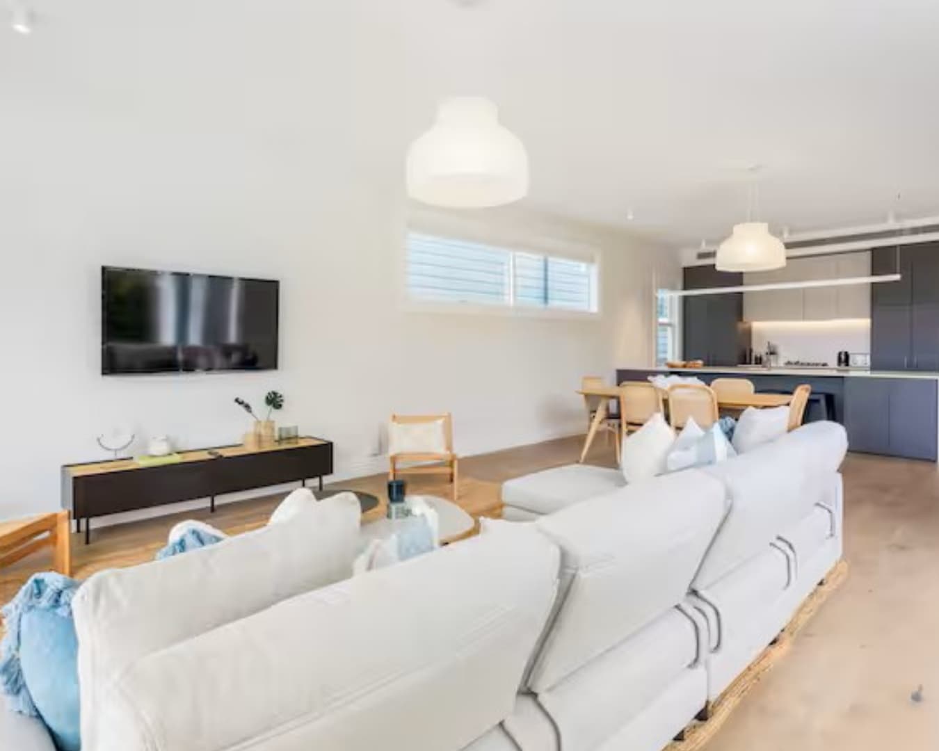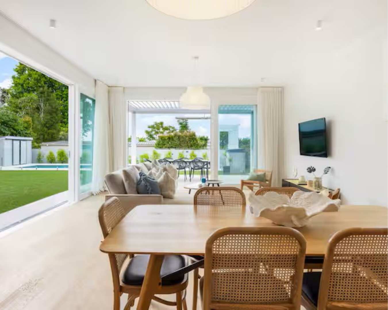 Open-plan living space with comfortable seating and a Smart TV. Large sliding doors open to the outdoor area, bringing in plenty of natural light and creating an easy indoor-outdoor flow.
