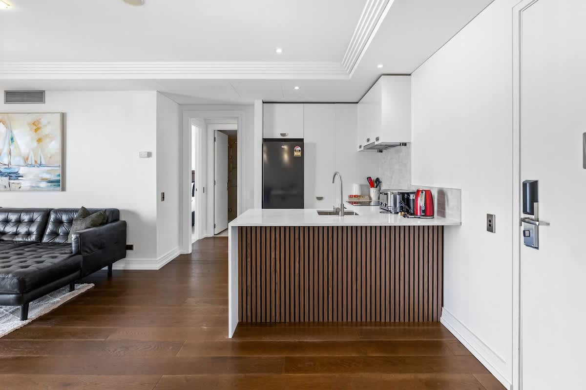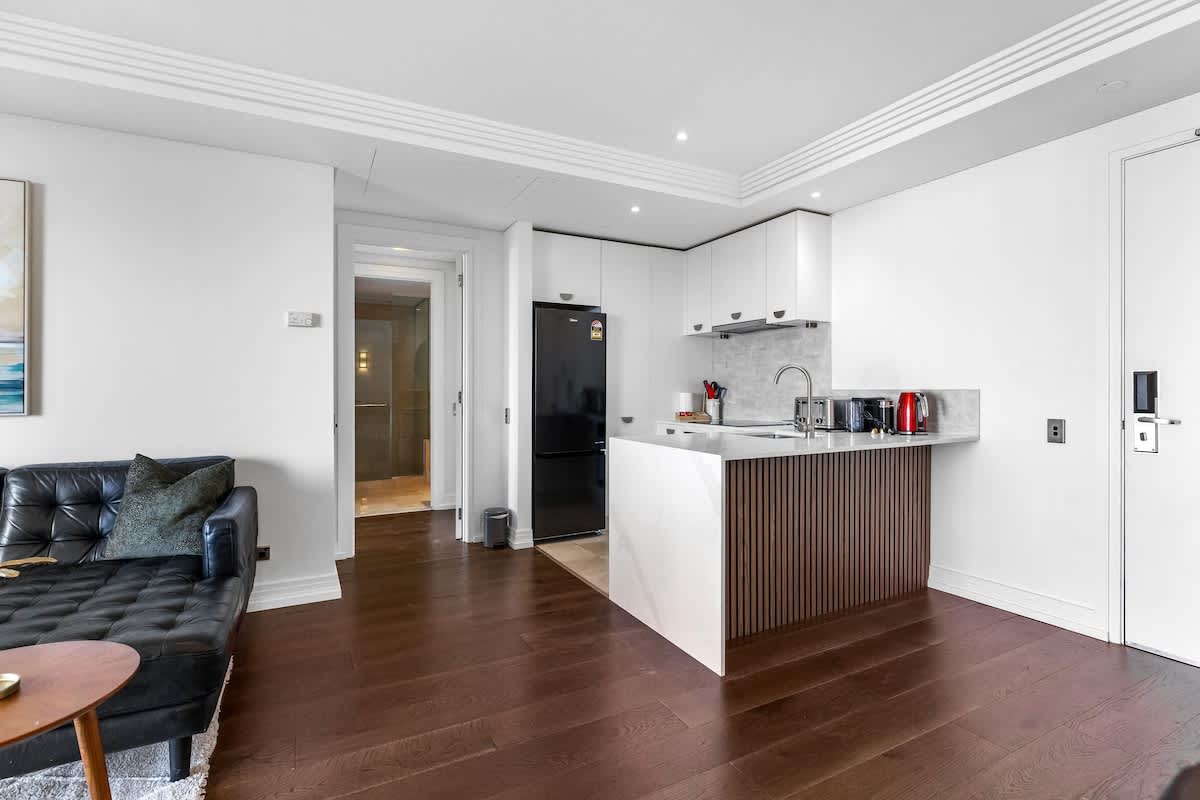 The spacious bedroom boasts a comfortable king-sized bed dressed in premium linen and soft pillows to ensure a restful night’s sleep. Wake up to gentle natural light and views over the city skyline, setting the tone for a great start to your day.