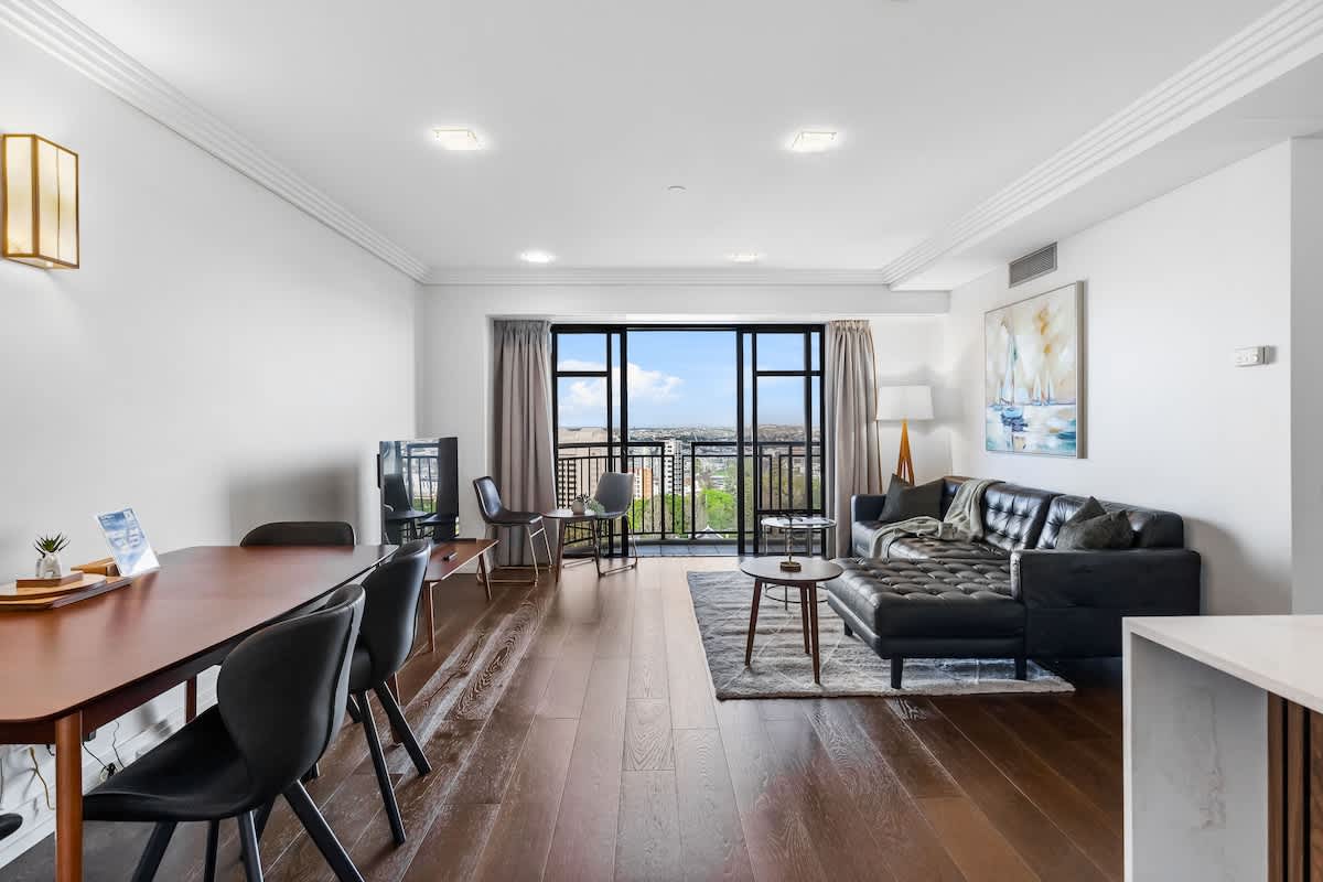 The living area offers a cozy lounge complete with a Smart TV, soft rug, and plush seating creating a warm and homely feel after a day in the city. Large glass doors open onto your private balcony, where you can sip your morning coffee or unwind with an evening drink while taking in lovely city views.