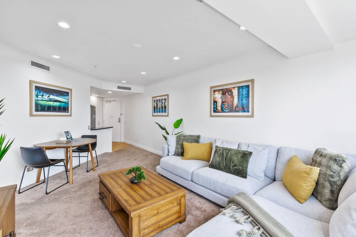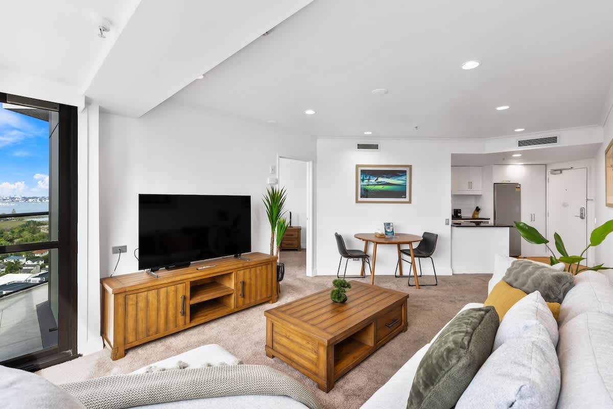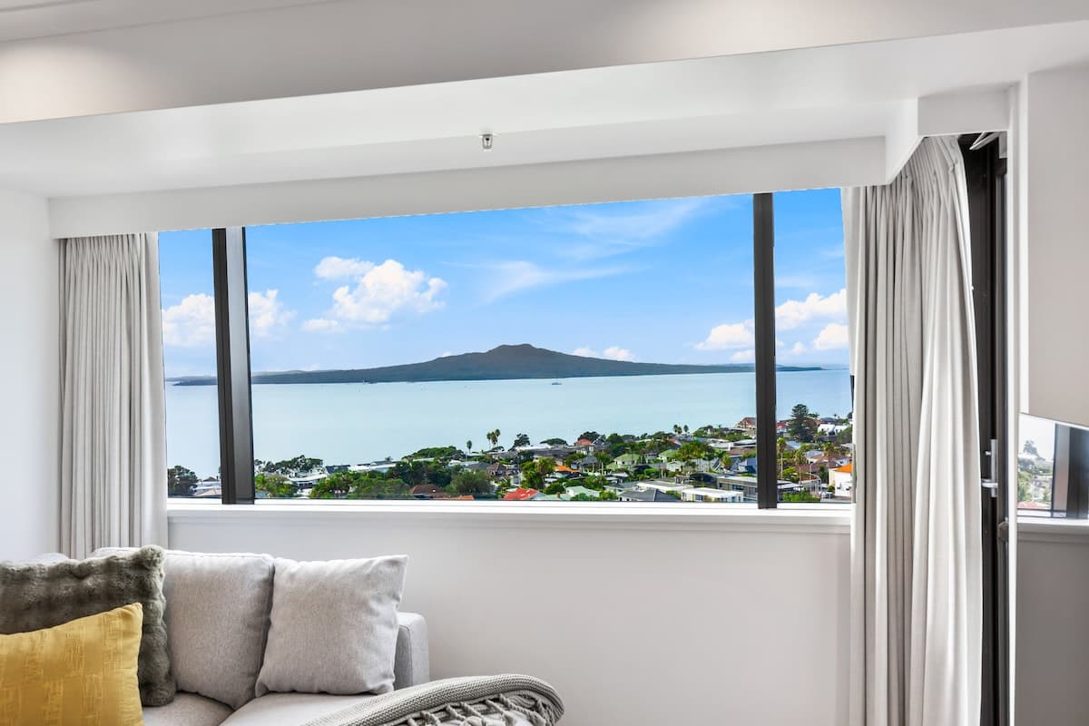Unwind in the inviting and spacious living area, thoughtfully designed for comfort and relaxation. Sink into the plush sofa while enjoying your favorite shows or movies on the smart TV, perfect for cozy evenings in. Large windows fill the space with natural light and offer stunning, uninterrupted views of the beautiful Takapuna Beach — a breathtaking backdrop to your stay.