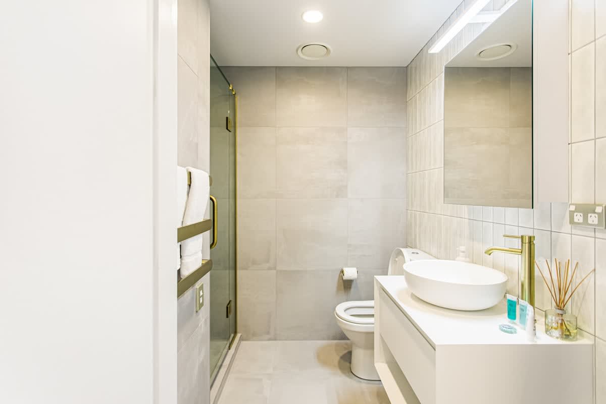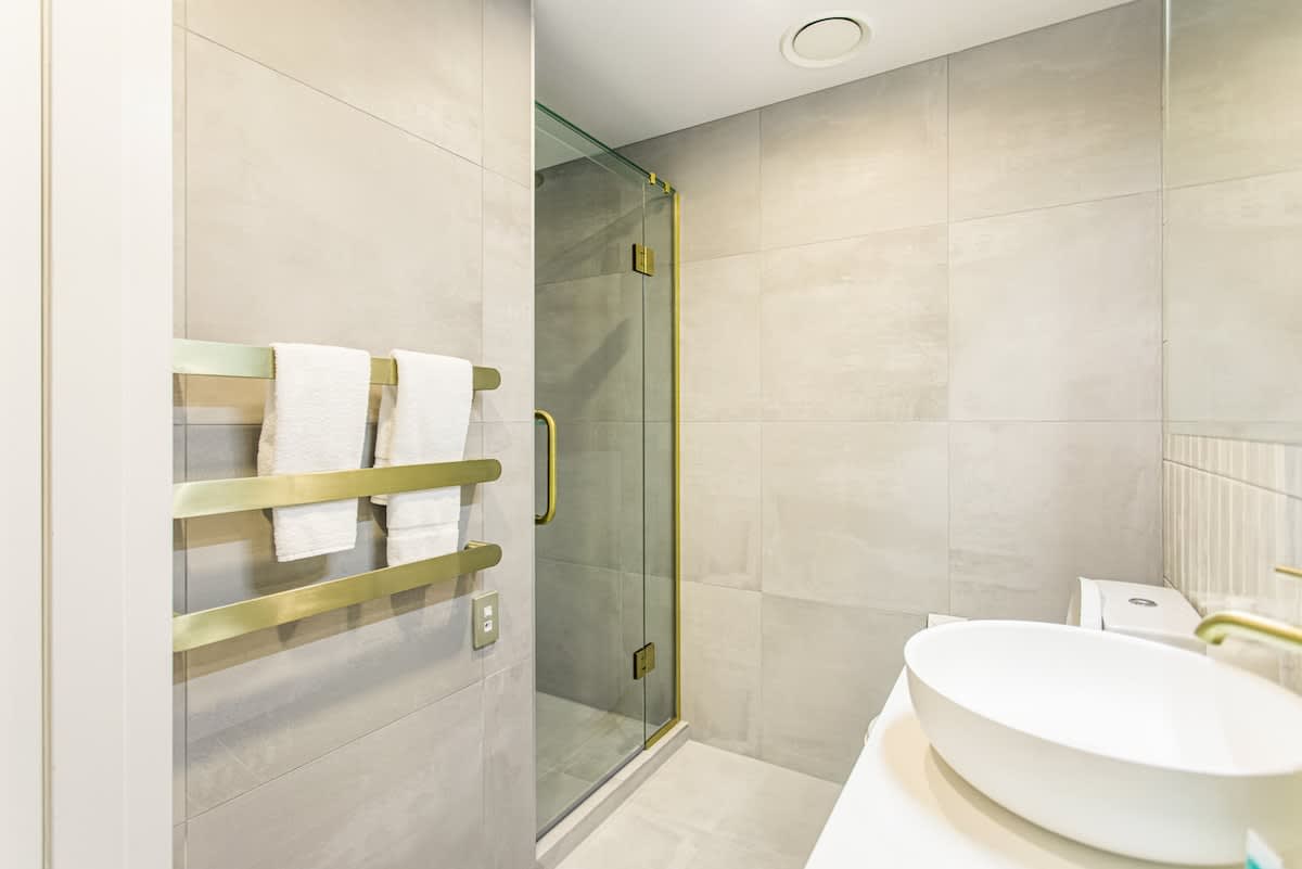 The modern bathroom is clean, sleek, and well-appointed—ideal for a quick morning routine or a relaxing evening freshen-up. With quality fittings and thoughtful touches, it's designed to enhance your overall comfort throughout your stay.
