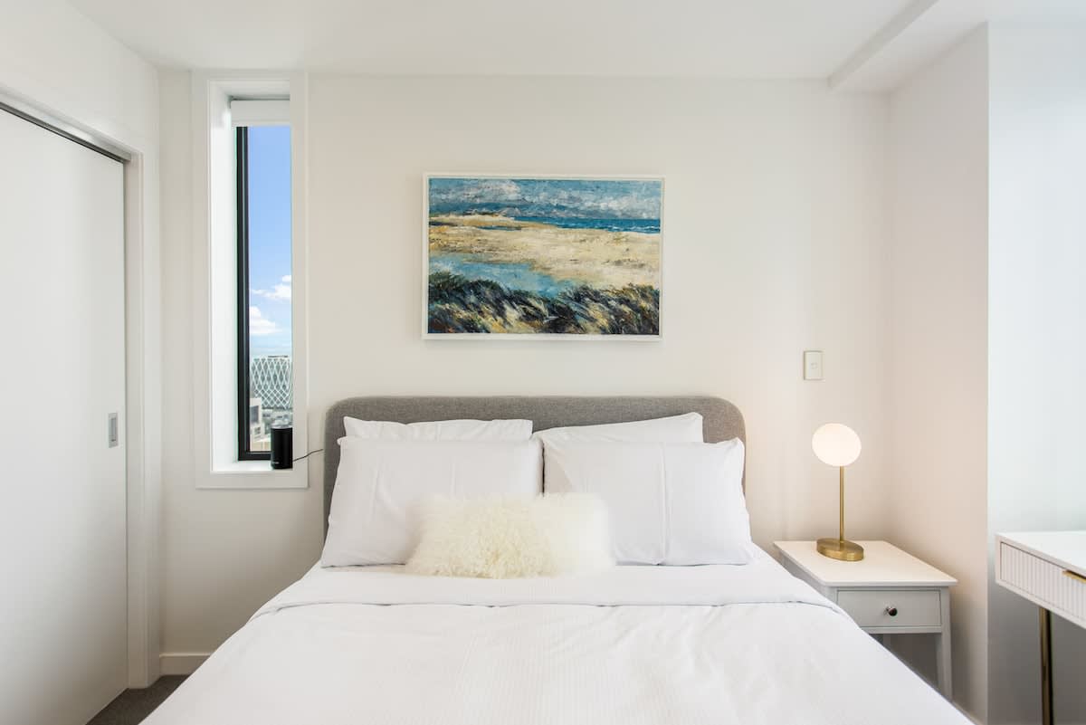 Both bedrooms have been thoughtfully designed to ensure a restful and rejuvenating stay. Each room features comfortable beds with plush pillows and crisp, fresh linens, creating a cozy sanctuary to unwind after a day of exploring the city. You’ll also find storage space, allowing you to unpack and settle in with ease during your stay. The master bedroom features a dedicated workspace, making it ideal for guests who need to catch up on emails or work remotely during their stay. Both bedrooms are designed with natural light in mind, featuring windows that let in plenty of sunlight during the day and can be closed off for privacy and rest at night. Each room is furnished with a bedside table and a stylish lamp, offering a warm and cozy ambiance—perfect for evening reading or winding down before bed.