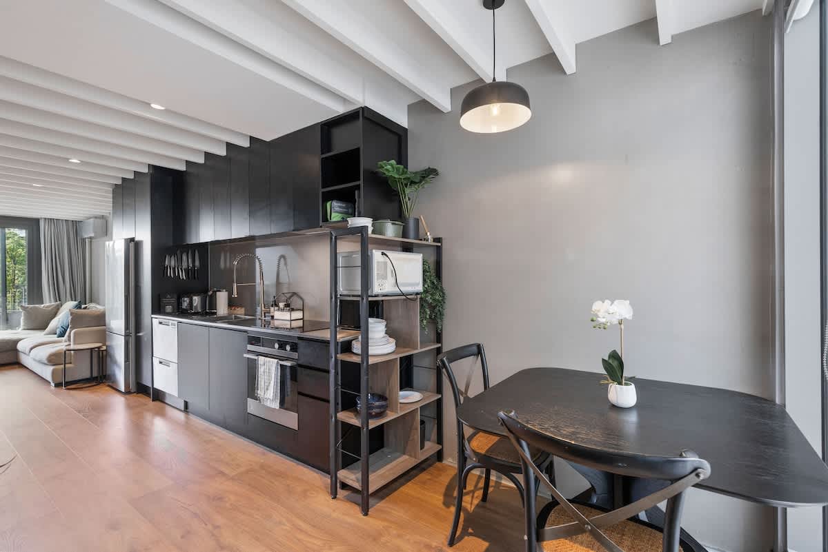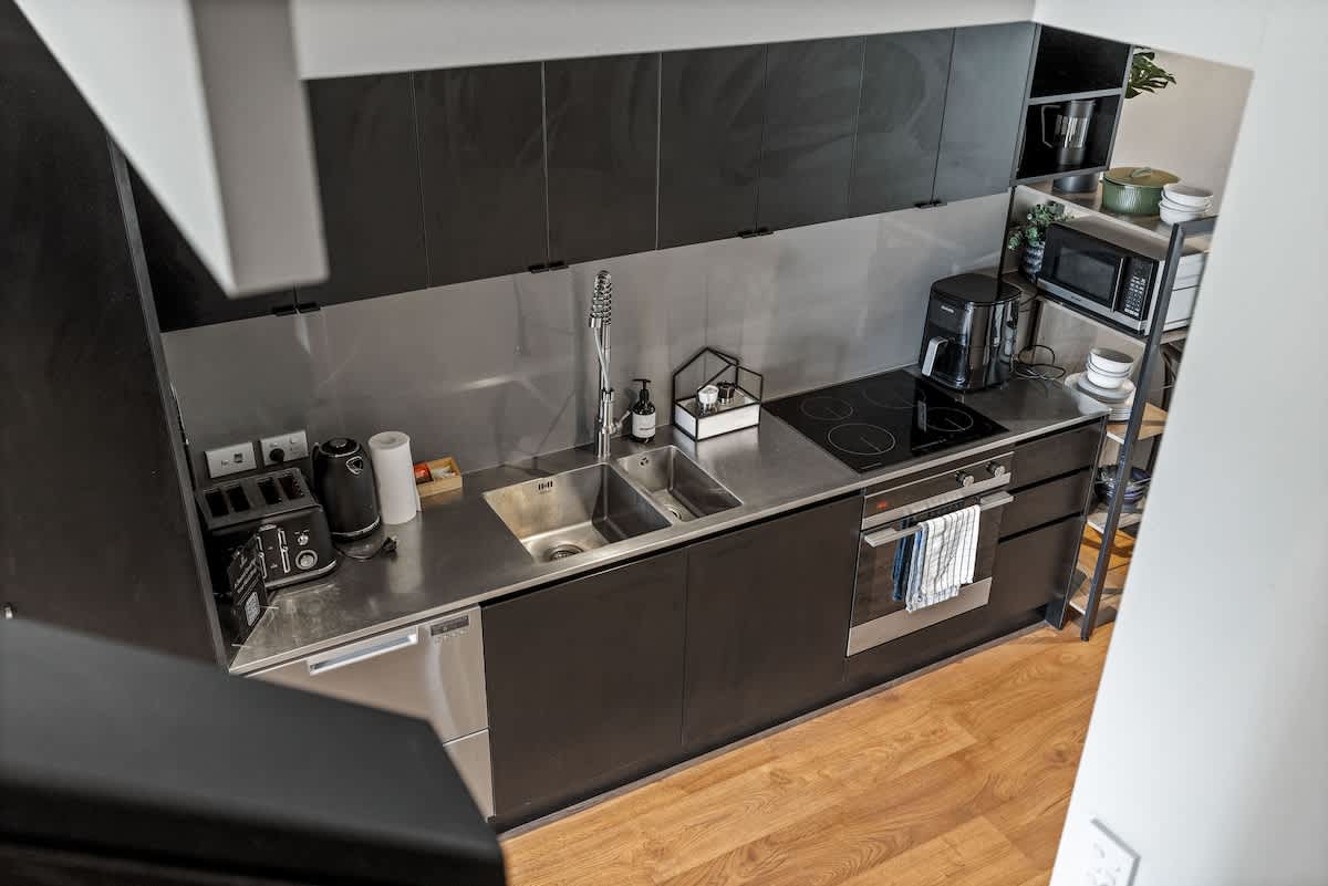 A dedicated workspace paired with fast, reliable Wi-Fi makes this apartment especially appealing for remote workers and business travellers. The fully equipped kitchen provides everything needed to cook with ease, including an oven, cooktop, microwave, dishwasher, and ample storage, ideal for both quick breakfasts and home-cooked dinners.