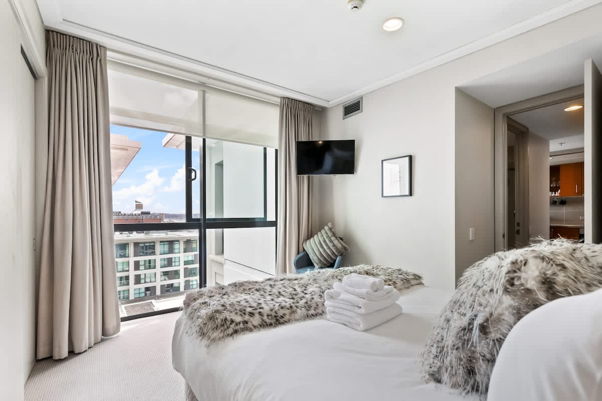 A bright, modern city retreat with floor-to-ceiling windows and a calm, hotel-like feel.