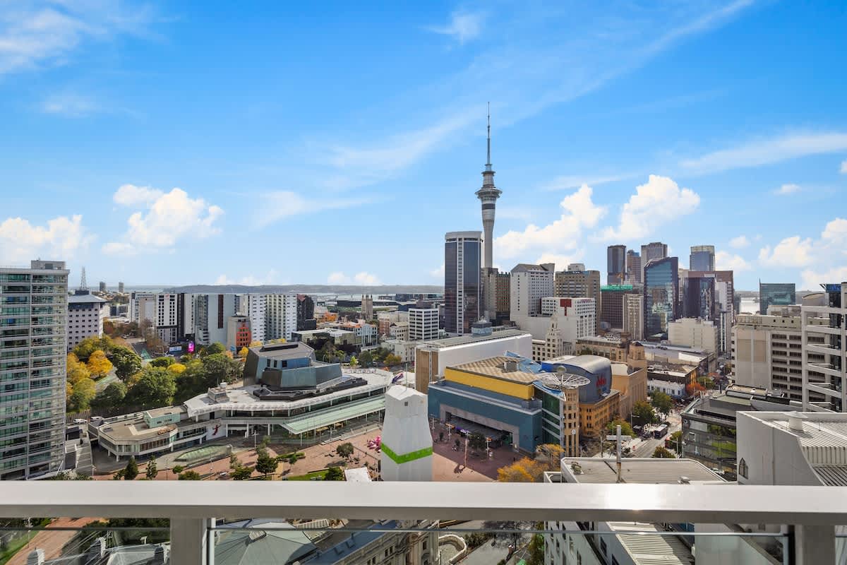 The apartment also boasts a balcony where you can enjoy stunning views of the iconic Sky Tower.