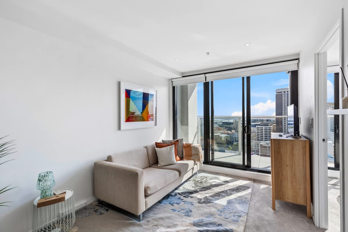 Relax in this stylish 2BR apartment with unbeatable Sky Tower views! It offers a queen bed, bunk beds, a full kitchen, plus free access to the gym and pool. Centrally located, just steps to Queen Street's vibrant shopping, dining, and transport options - everything you need for a comfortable stay!