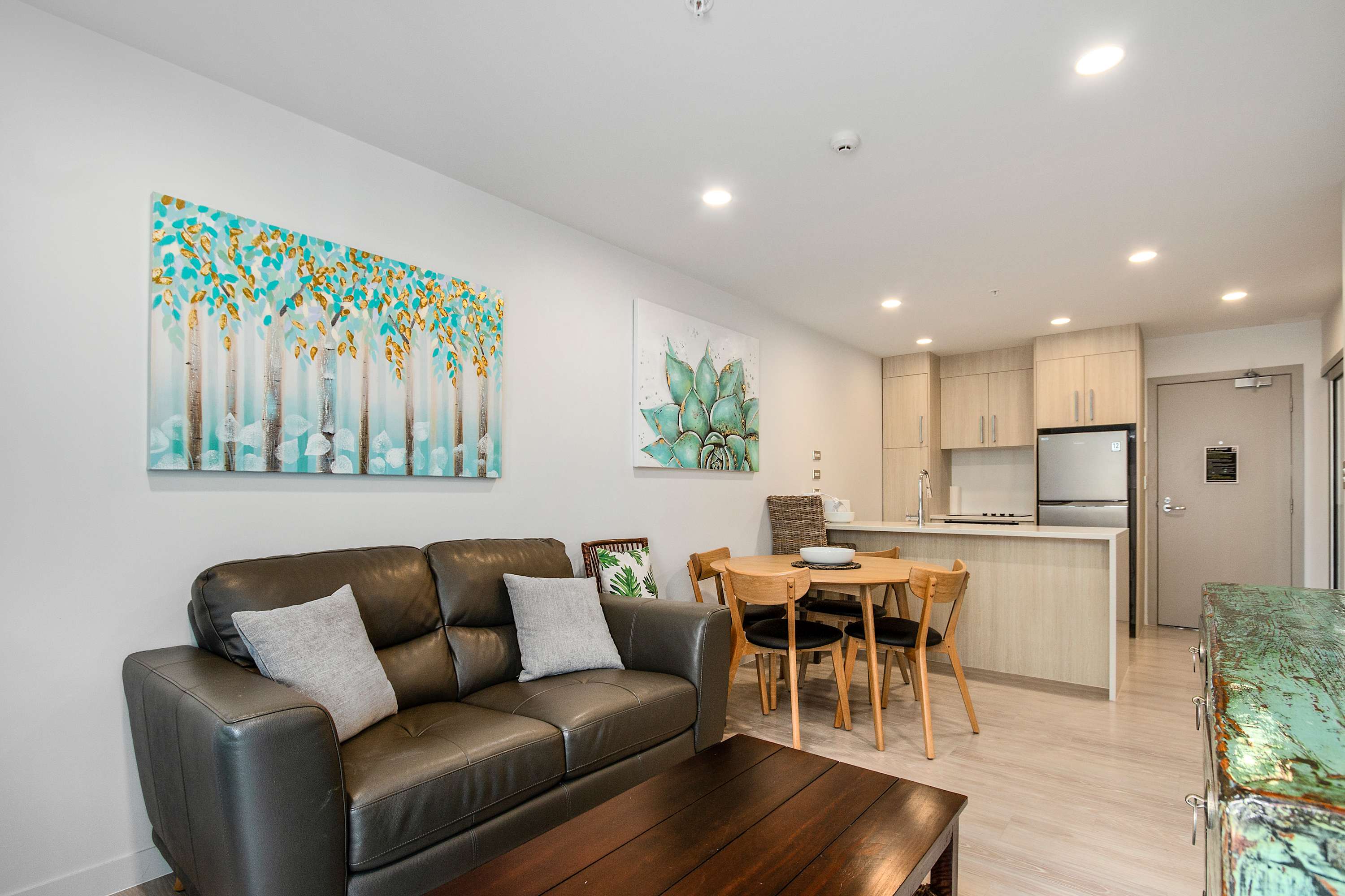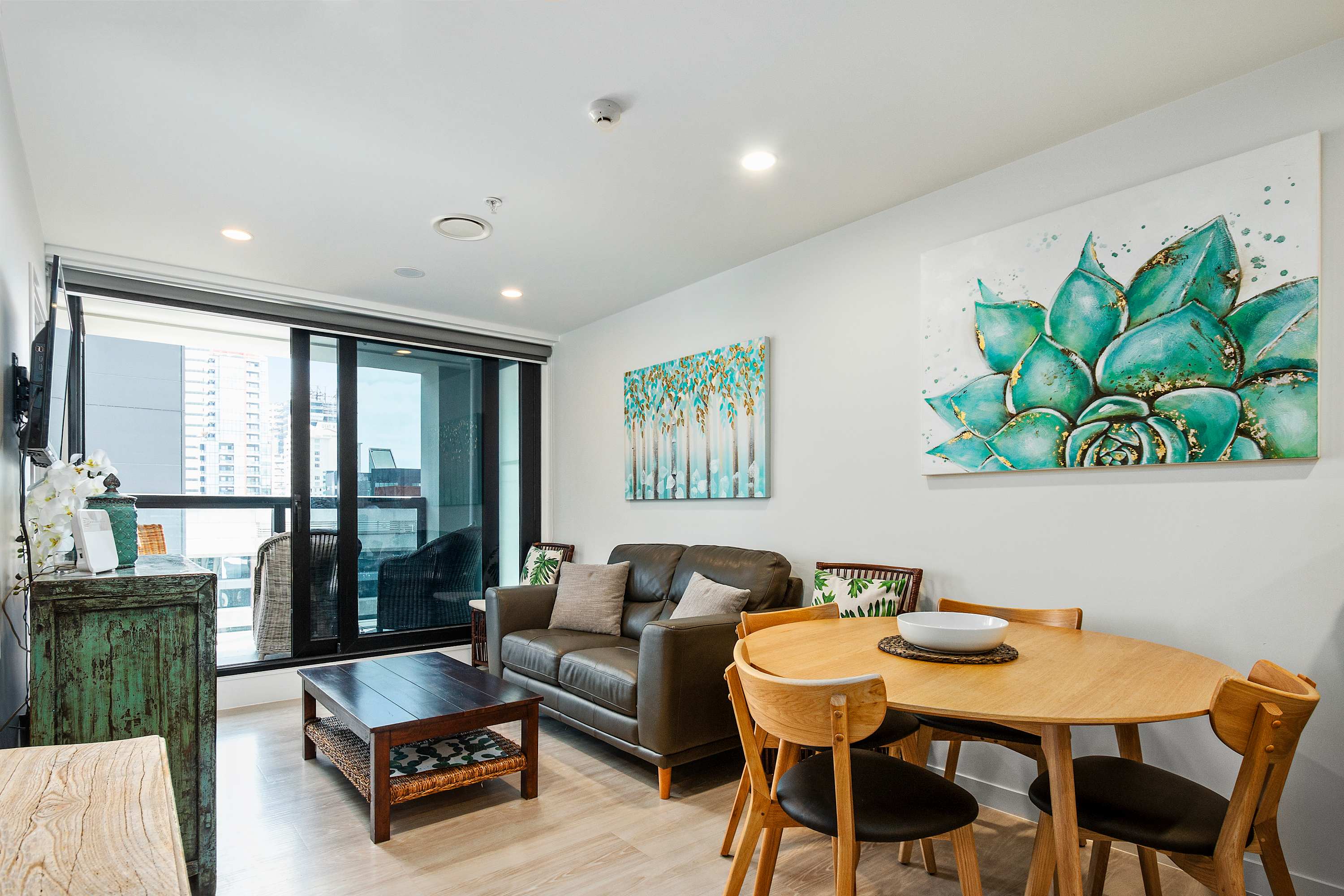 Relax in a bright, modern living space designed for comfort and convenience, featuring a plush sofa, Smart TV, and seamless access to a private balcony with sweeping city views and a glimpse of the ocean.