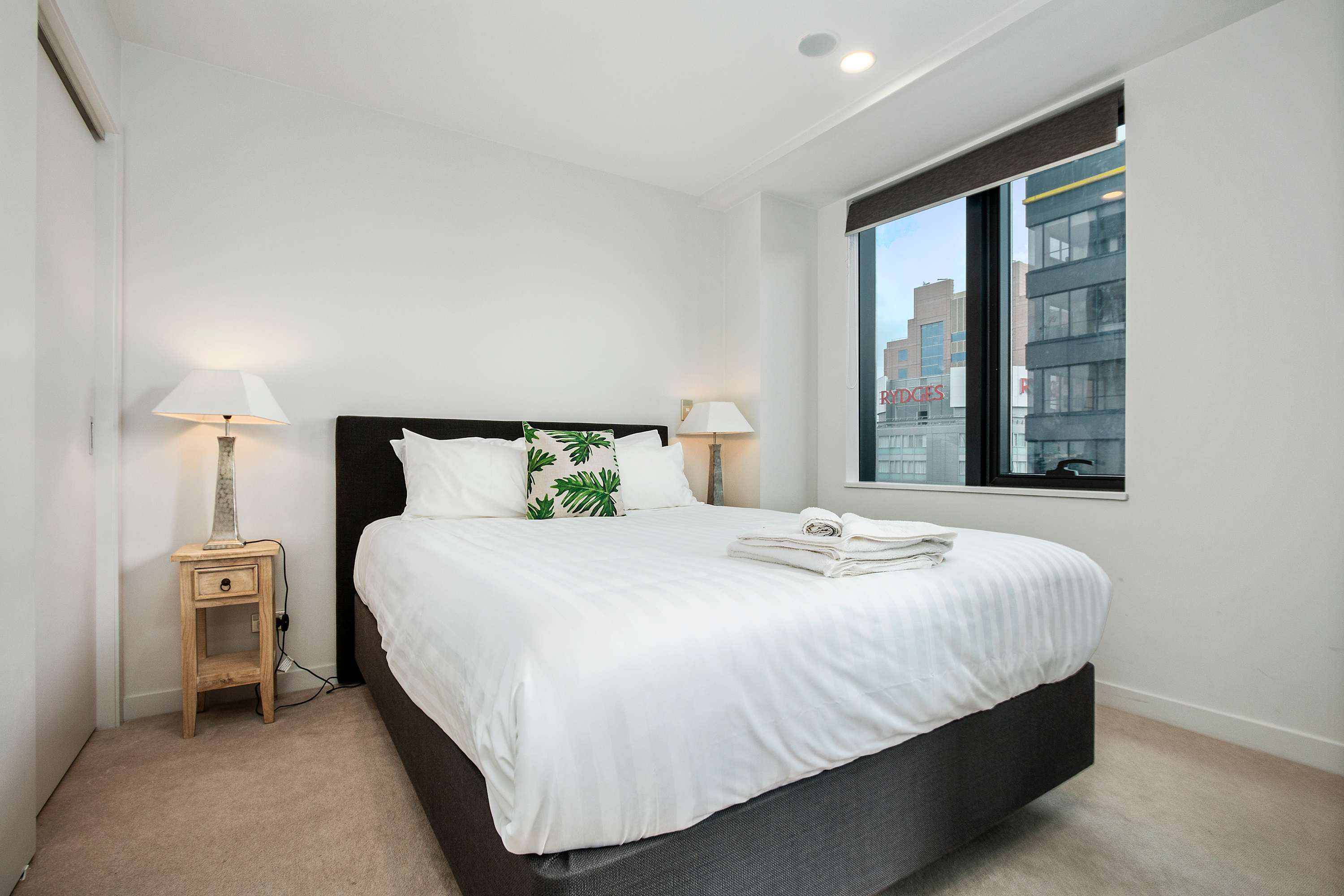 Both bedrooms feature brand-new queen-sized beds dressed for a restful night’s sleep, creating a calm and inviting retreat in the centre of the city. One bedroom also offers direct access to the bathroom, adding extra comfort and convenience for guests.