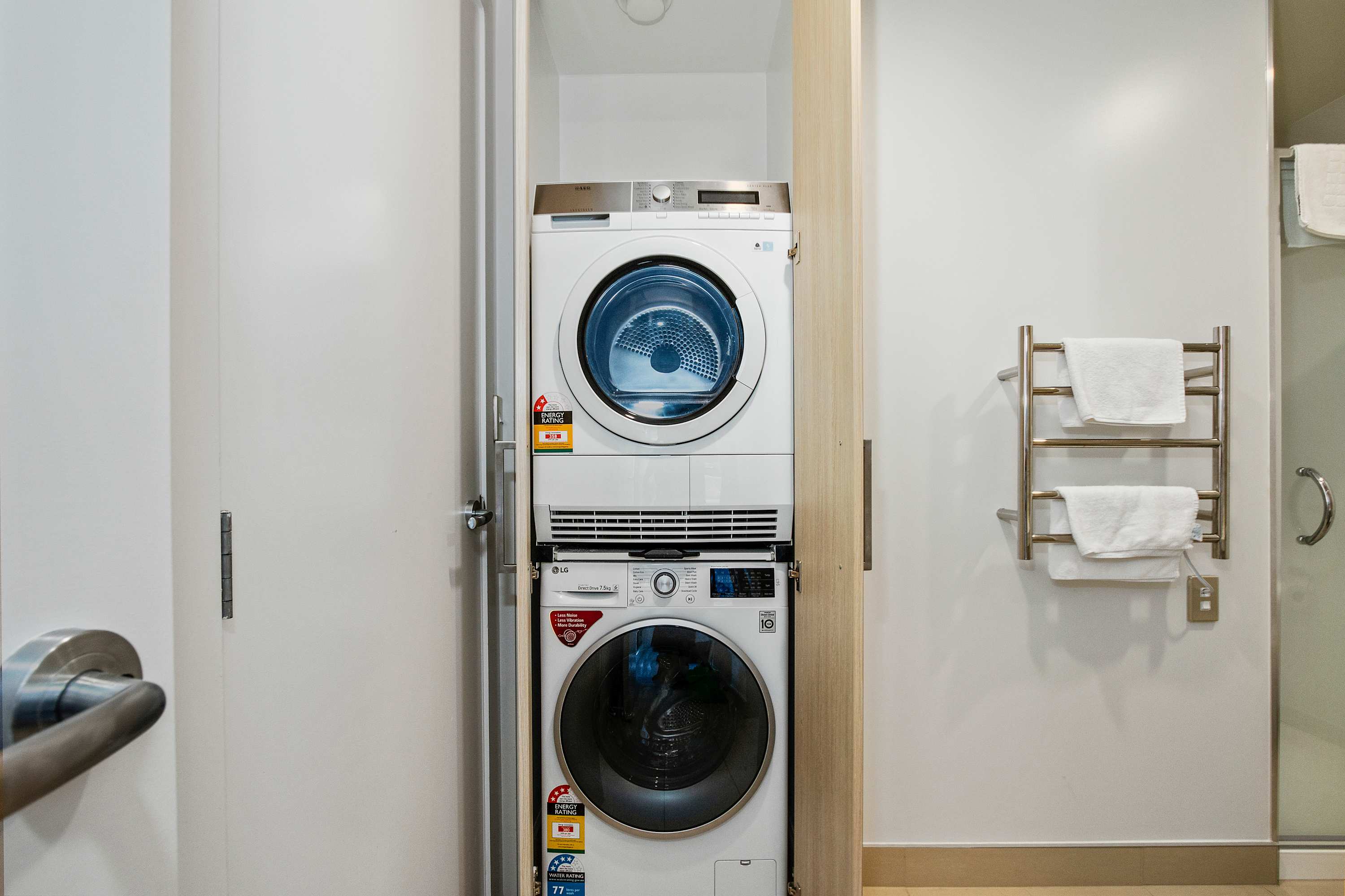 Fresh, modern, and thoughtfully appointed, the bathroom includes shampoo, conditioner, and body wash, along with the added convenience of a discreetly tucked-away washing machine and dryer which are free for your use.