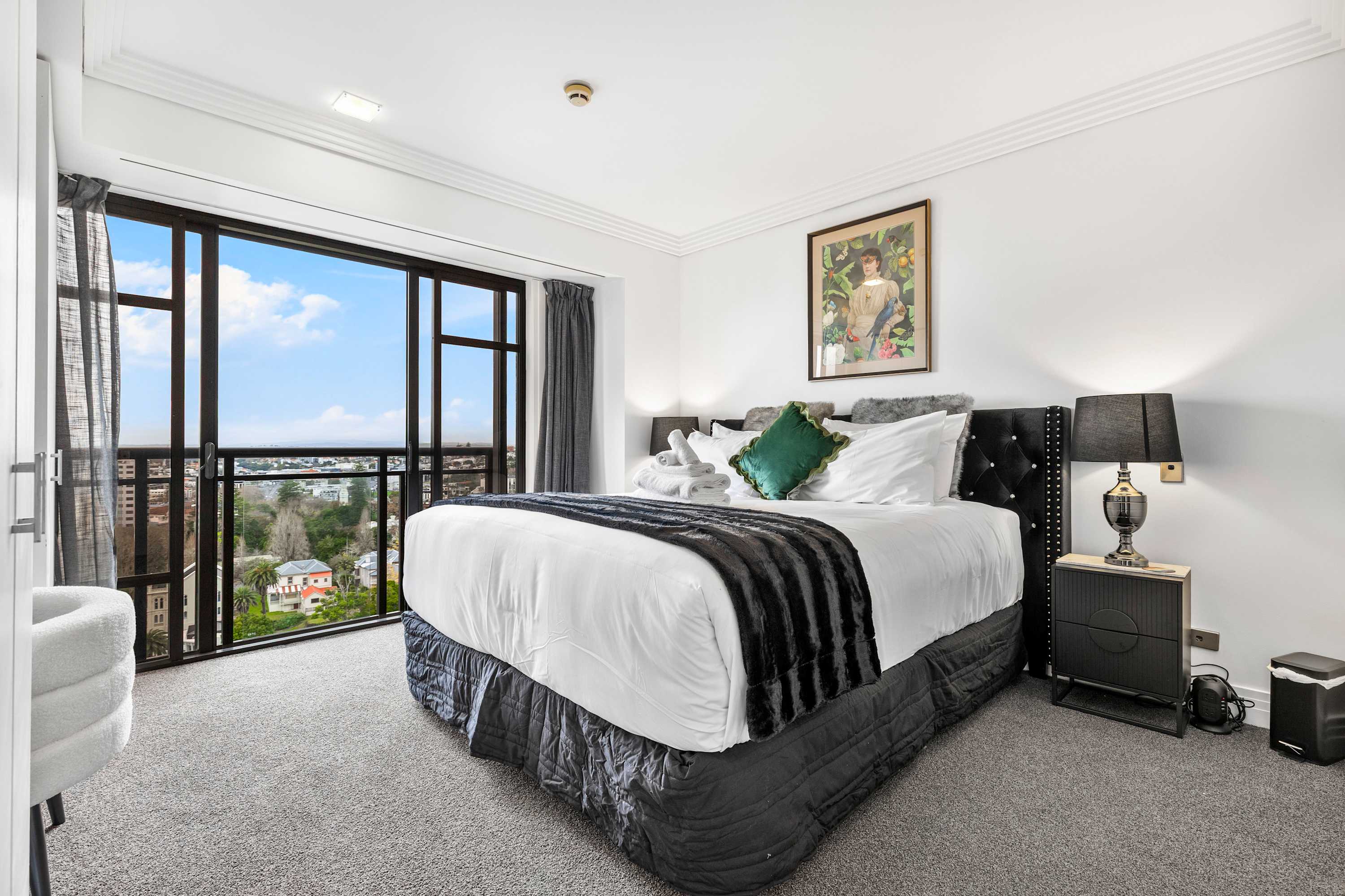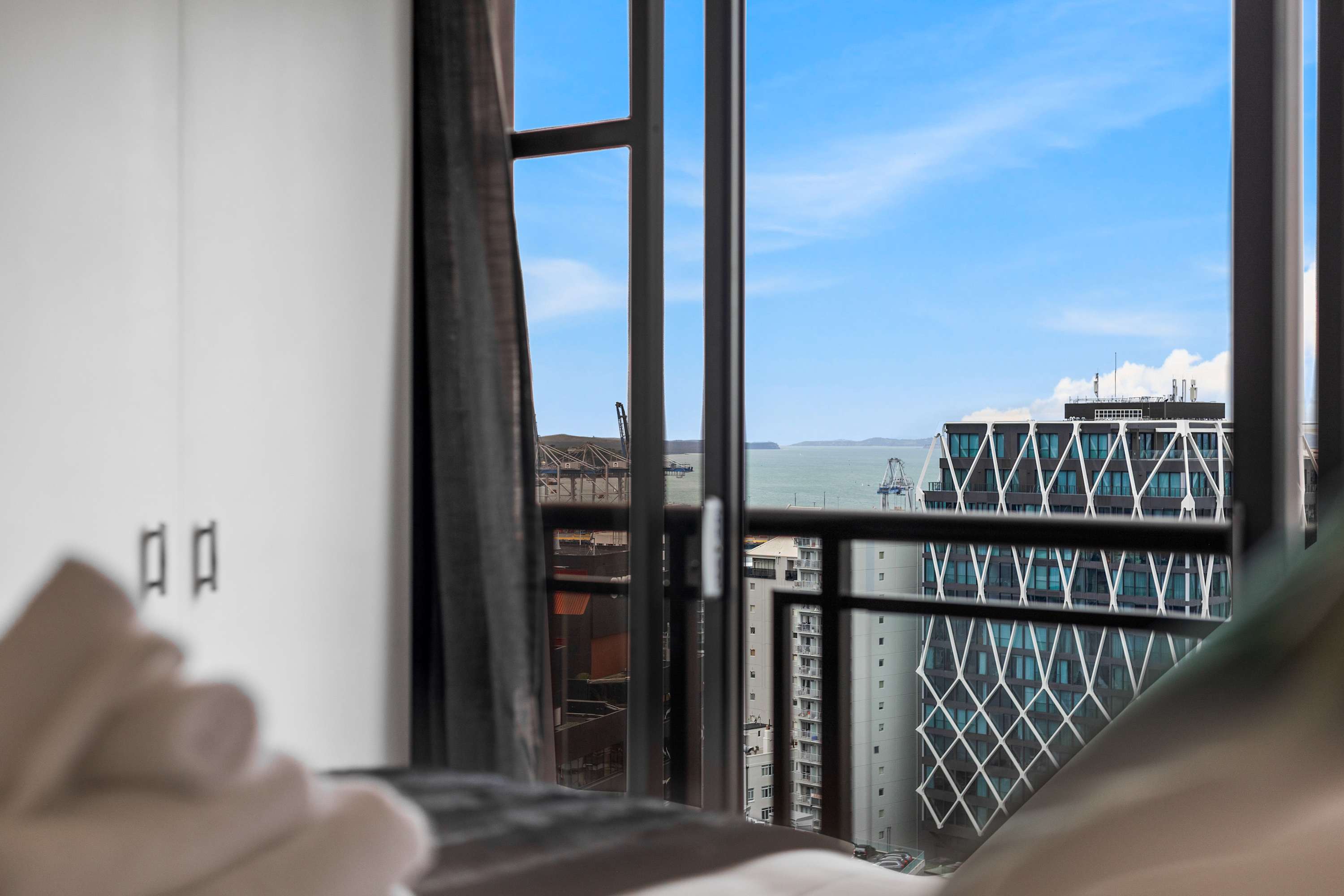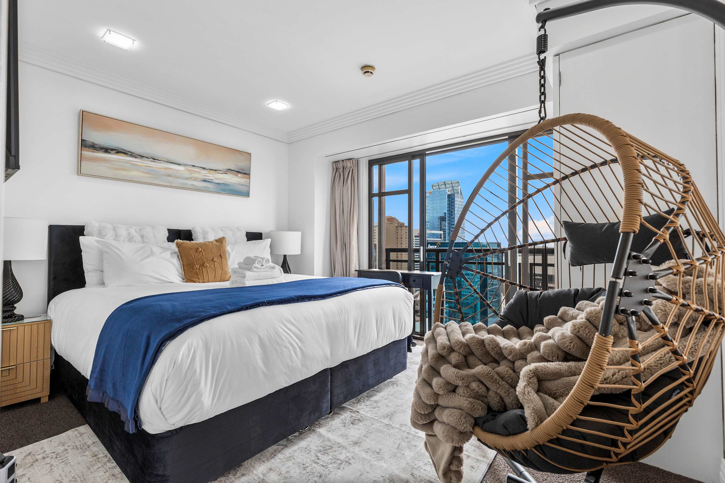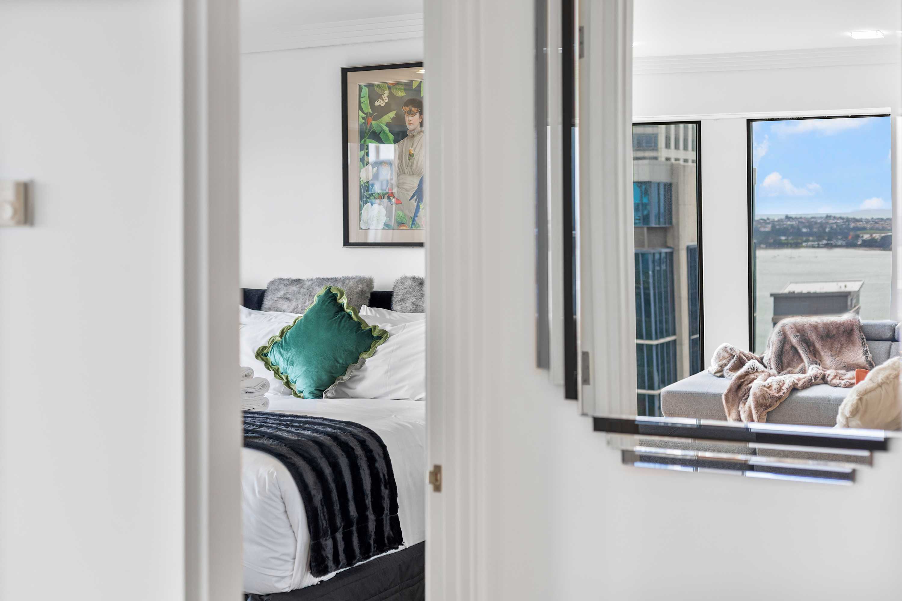 Each bedroom includes its own Smart TV, ideal for relaxing with your favorite shows, as well as a dedicated workspace, perfect for remote work or planning your next day’s adventure. You'll also find ample clothing storage in both rooms, so you can unpack and feel right at home. Both bedrooms offer direct access to charming Juliette balconies, allowing you to enjoy fresh air and take in breathtaking views of Auckland’s iconic skyline right from the comfort of your room. Whether you’re starting your day with a cup of coffee or winding down in the evening with a glass of wine, the balconies provide a peaceful space to relax and soak up the city’s vibrant atmosphere.