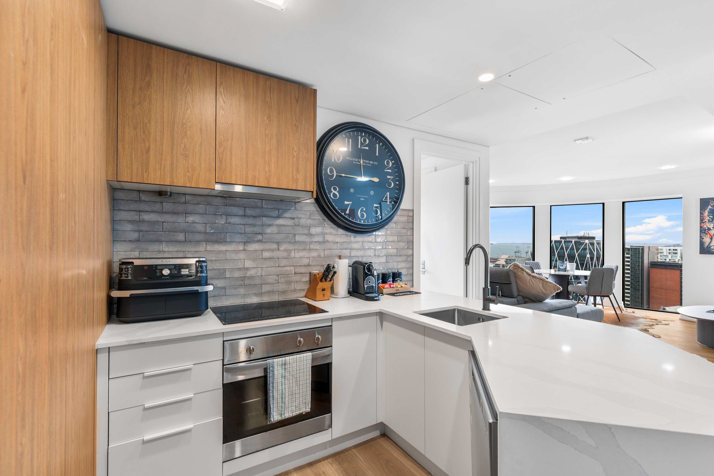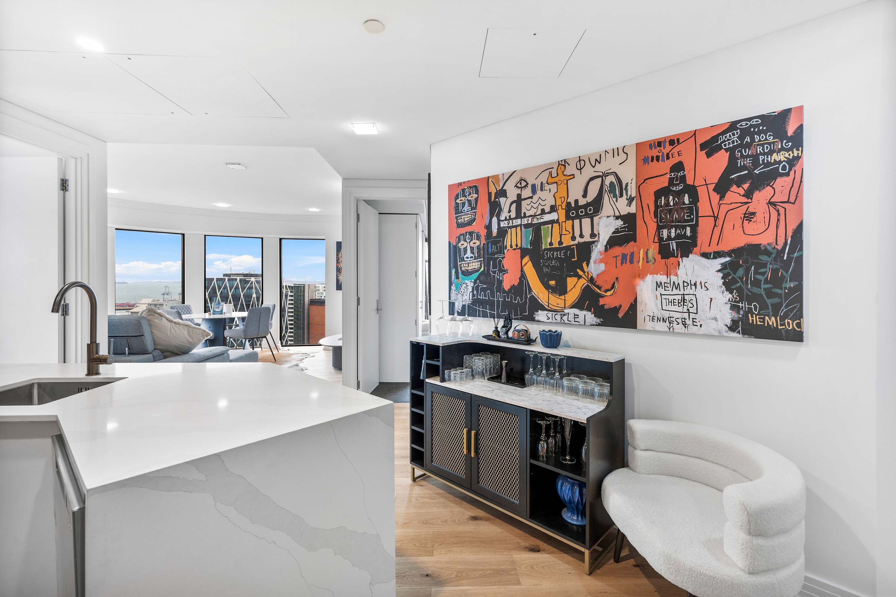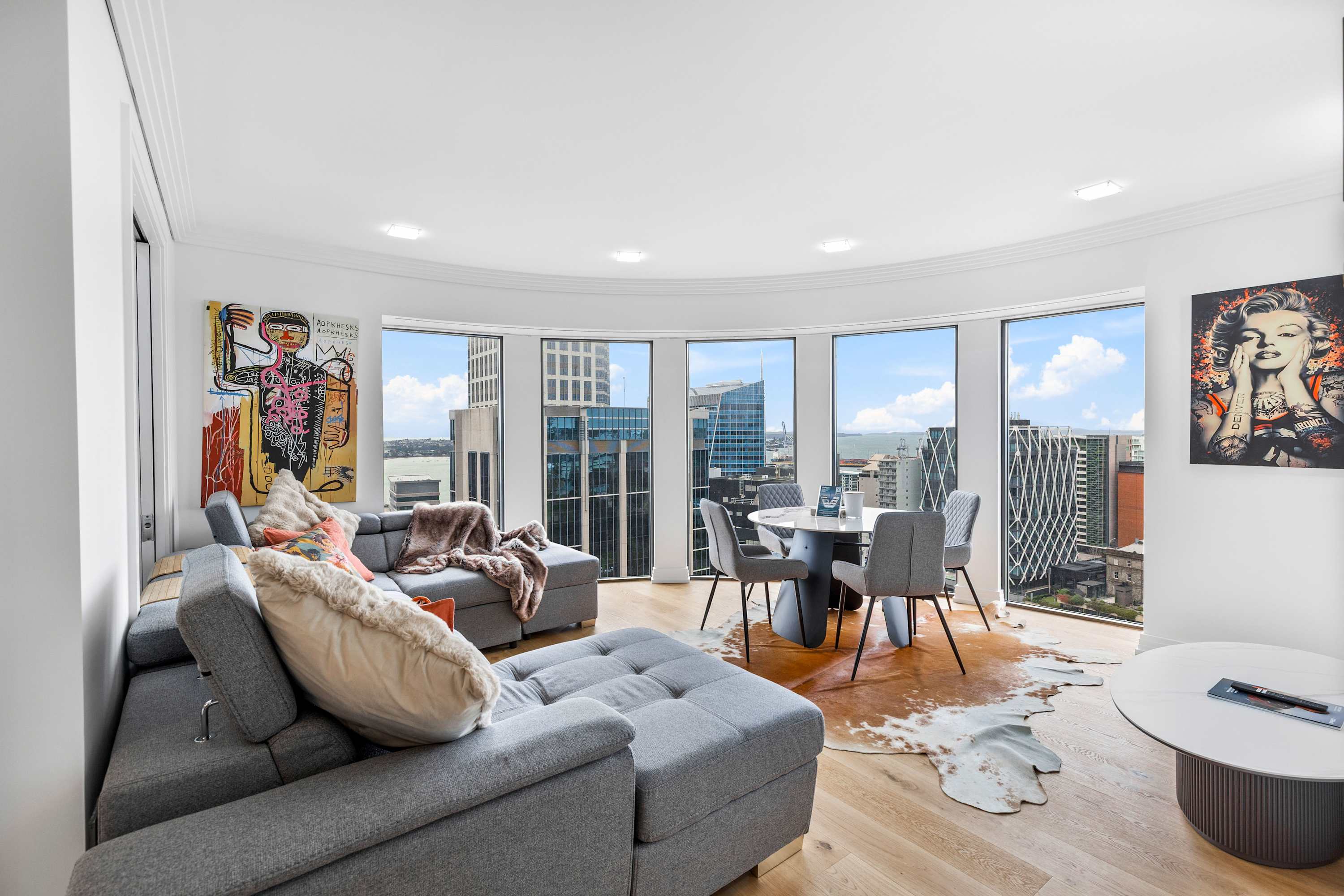 The spacious and elegantly designed living room offers the perfect blend of comfort and sophistication. Sink into the plush sectional sofa, complete with soft, textured throw pillows and tasteful designer accents that elevate the space. After a day of exploring Auckland’s vibrant city scene, it’s the ideal place to relax and recharge.