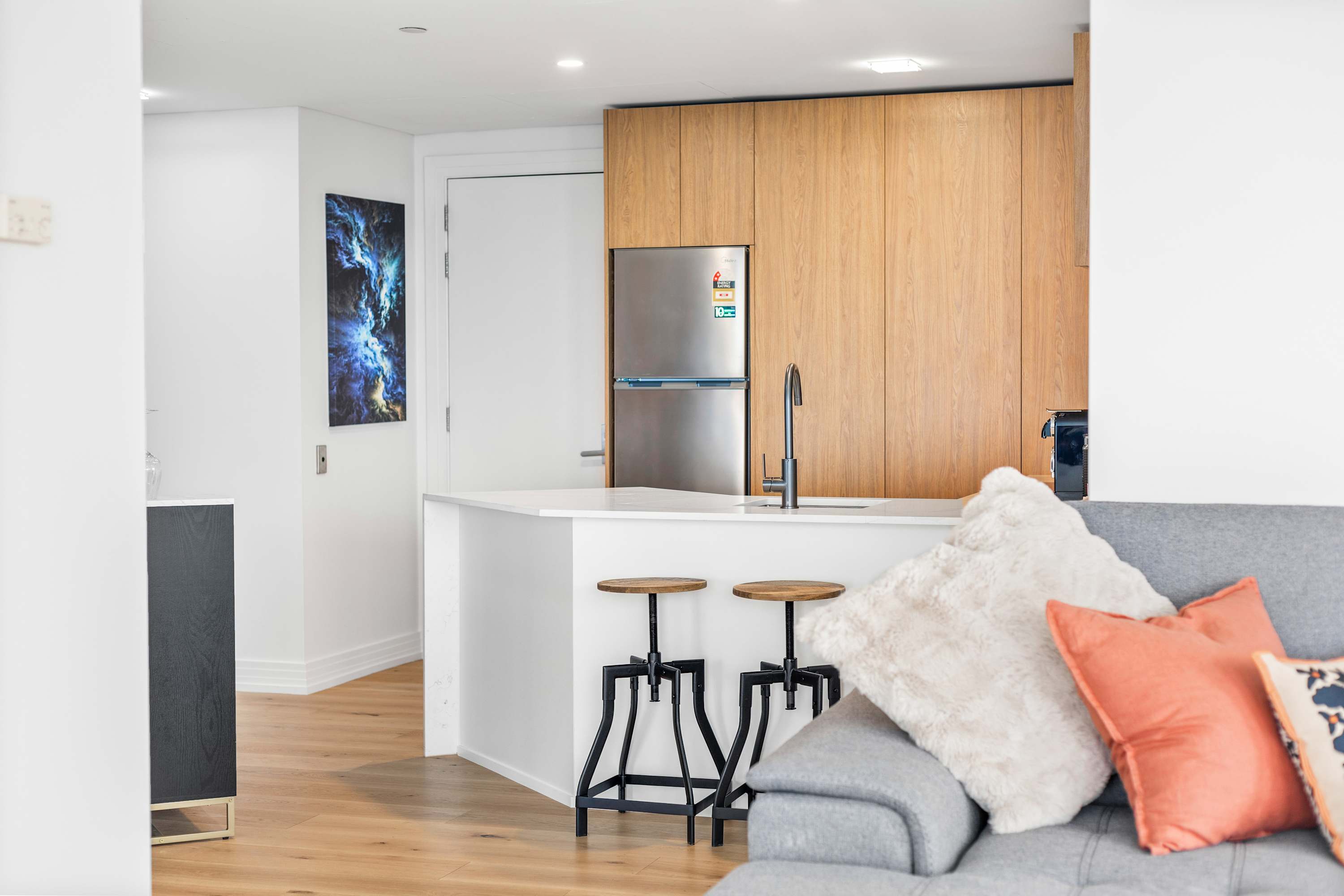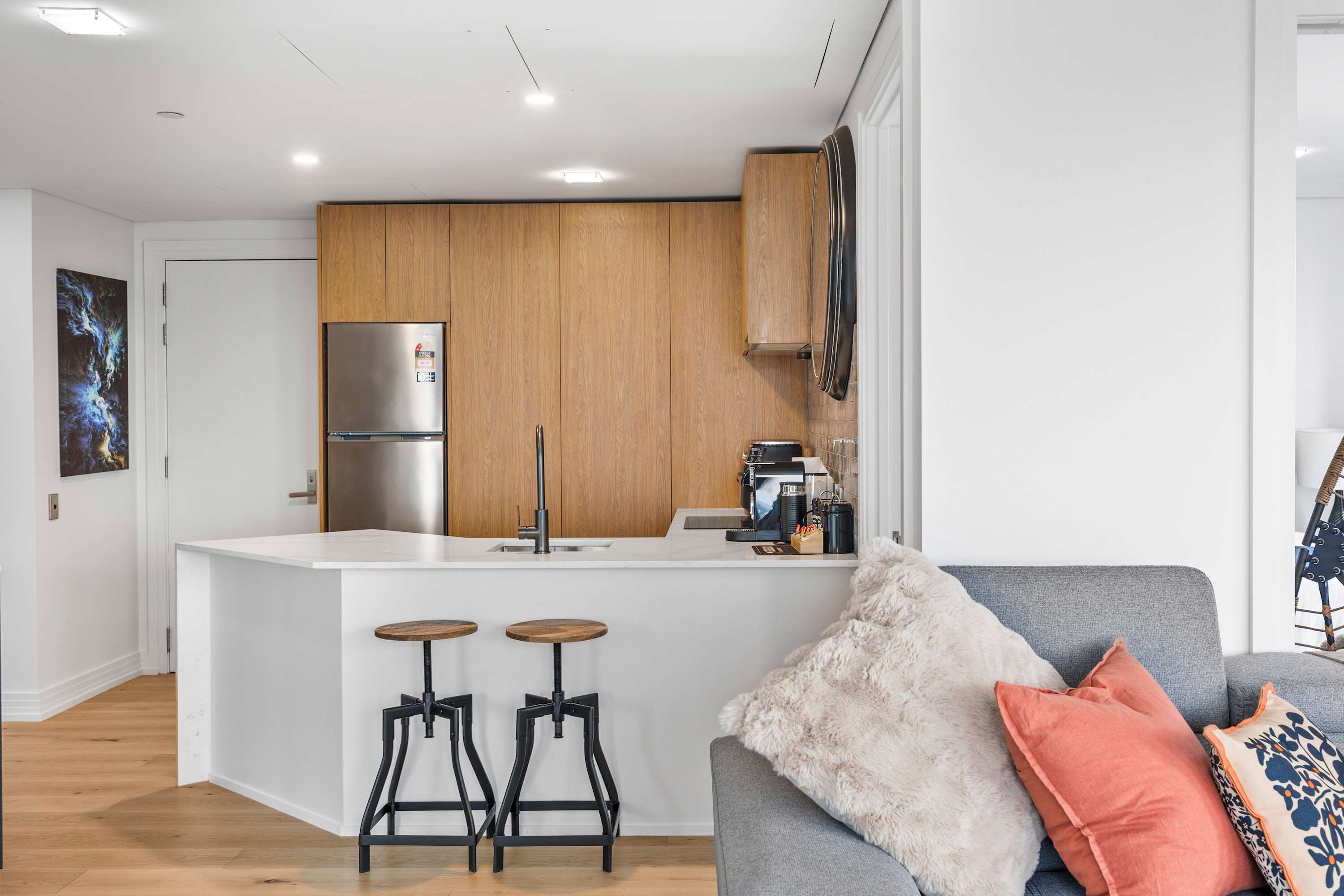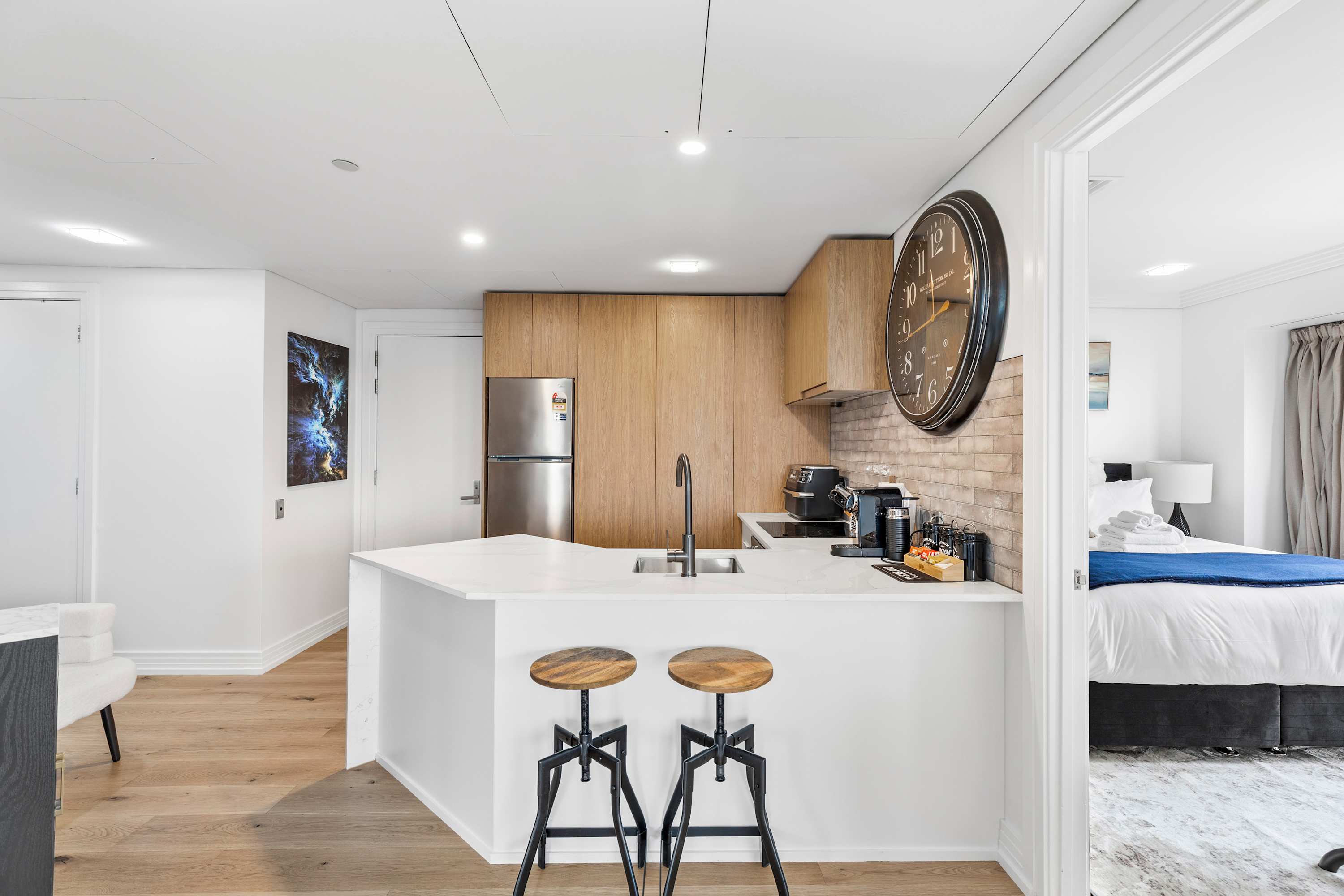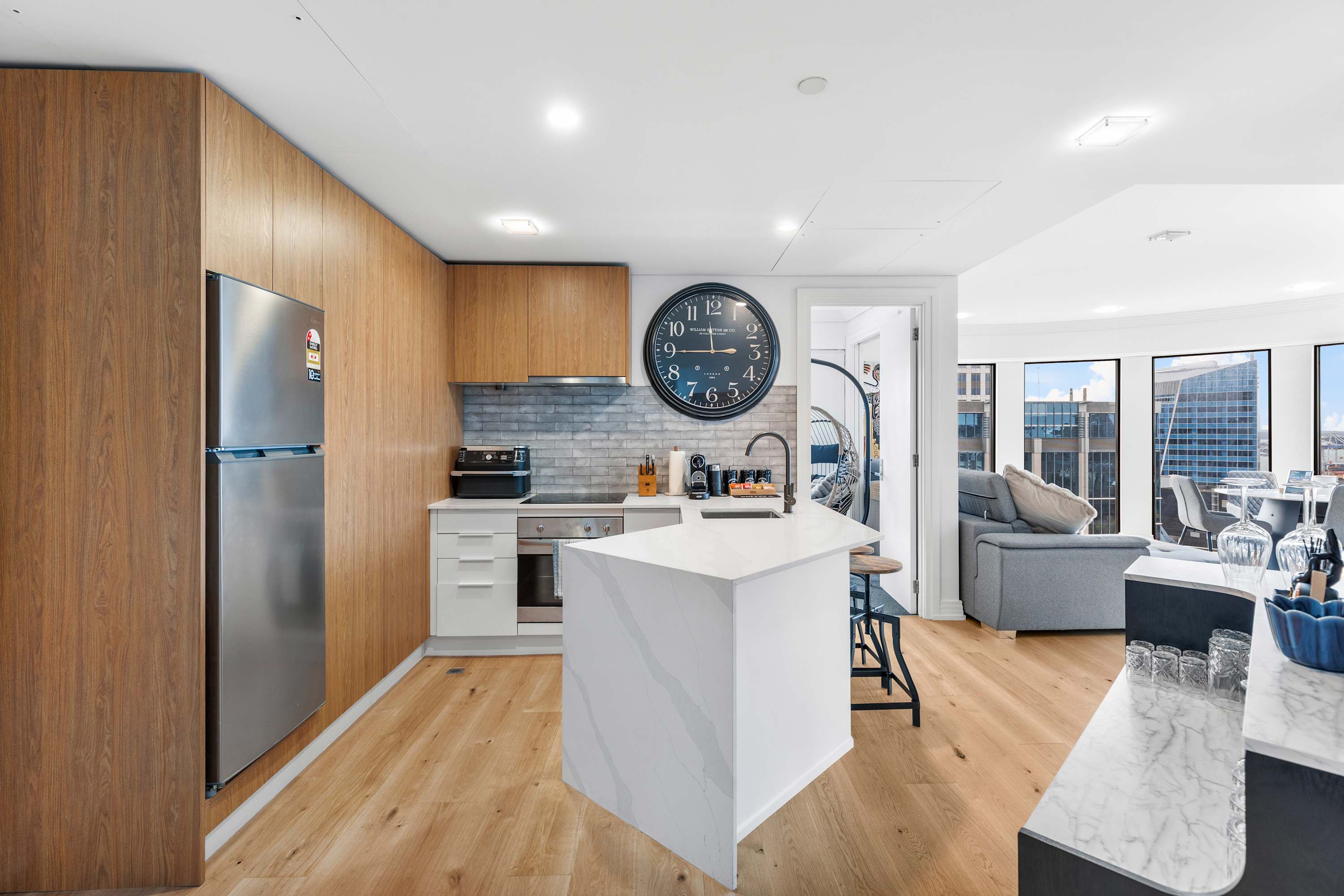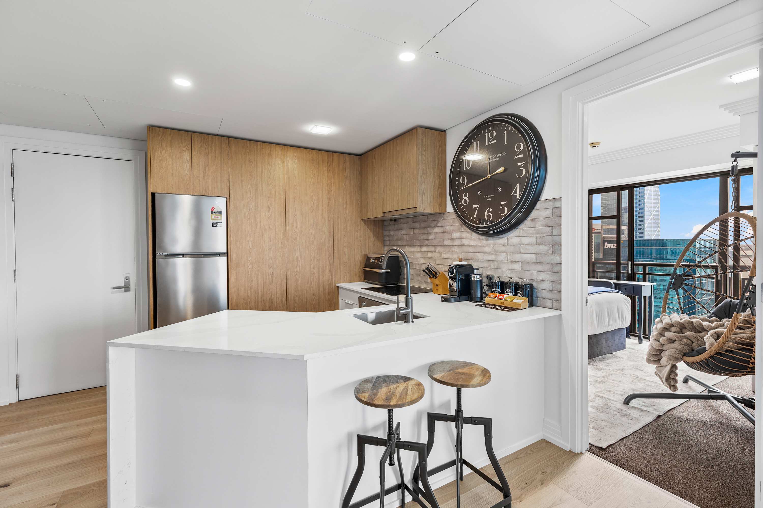 A sleek breakfast bar with stylish stools makes the perfect spot for your morning coffee or relaxed evening drinks. Whether you're here for a weekend or a longer stay, this kitchen and dining setup offers all the comforts of home in the heart of the city.