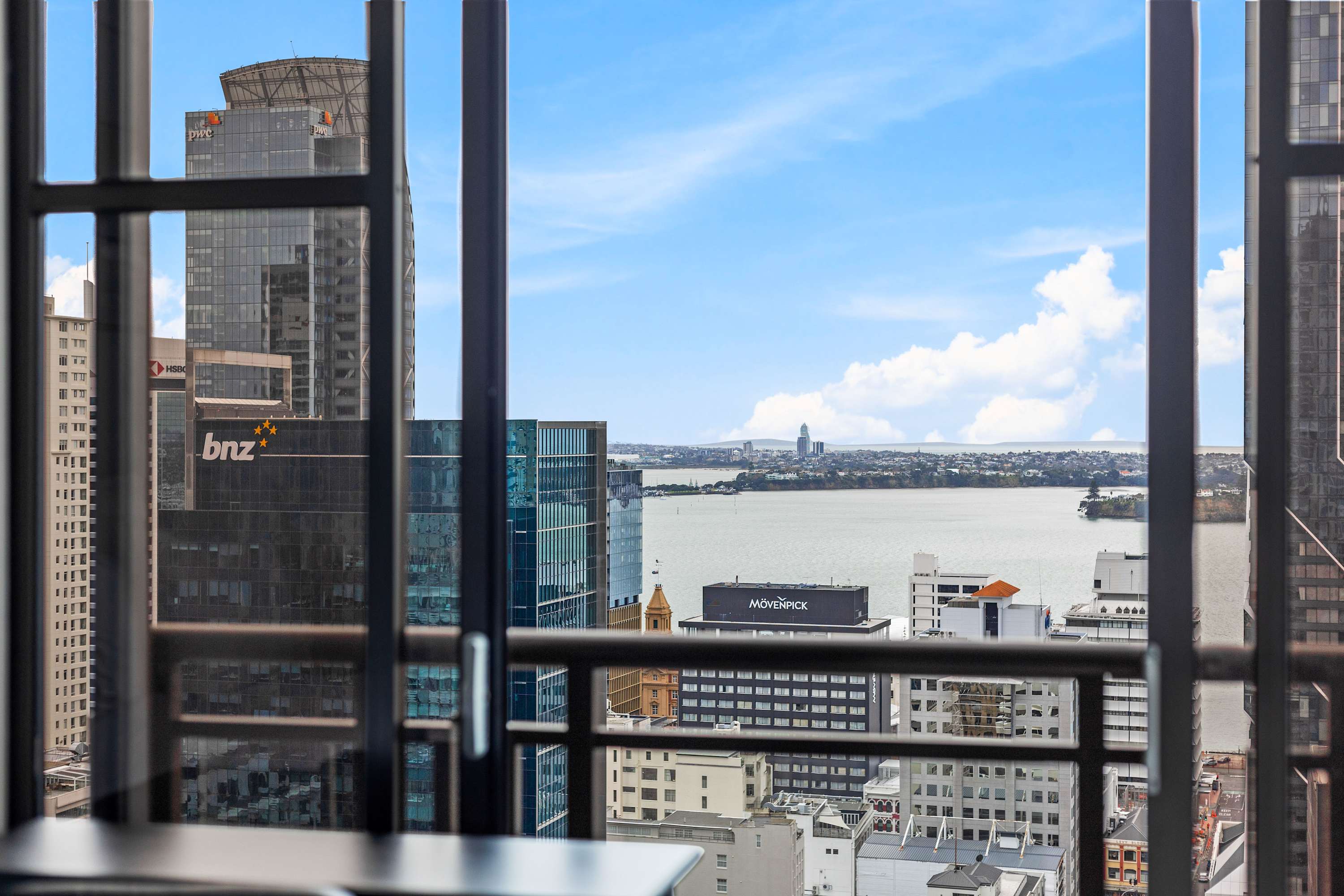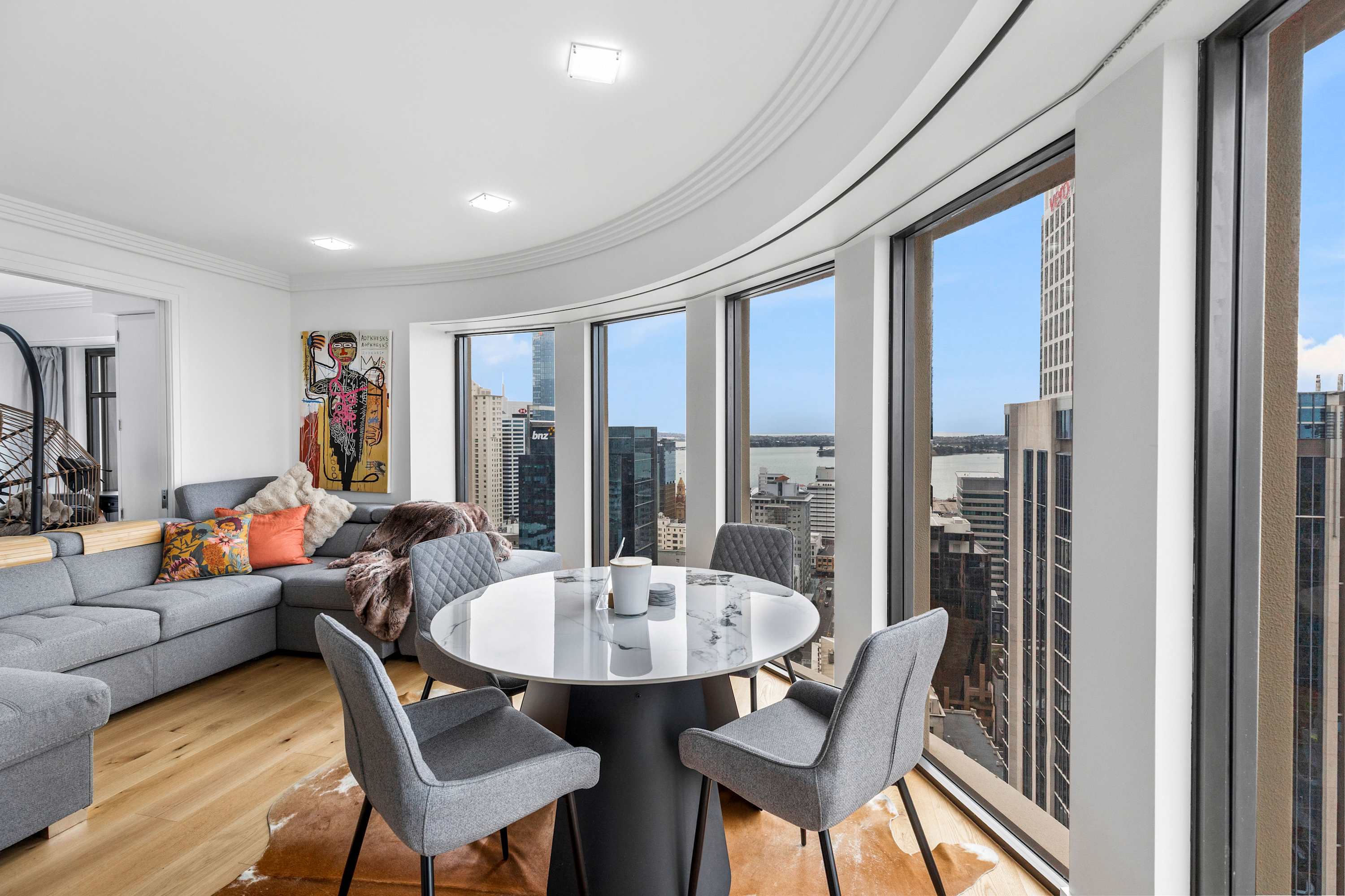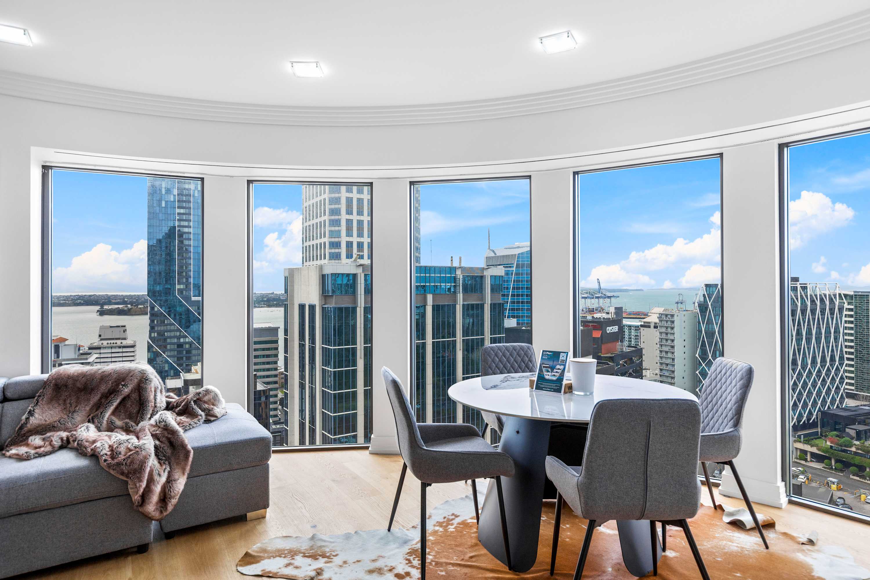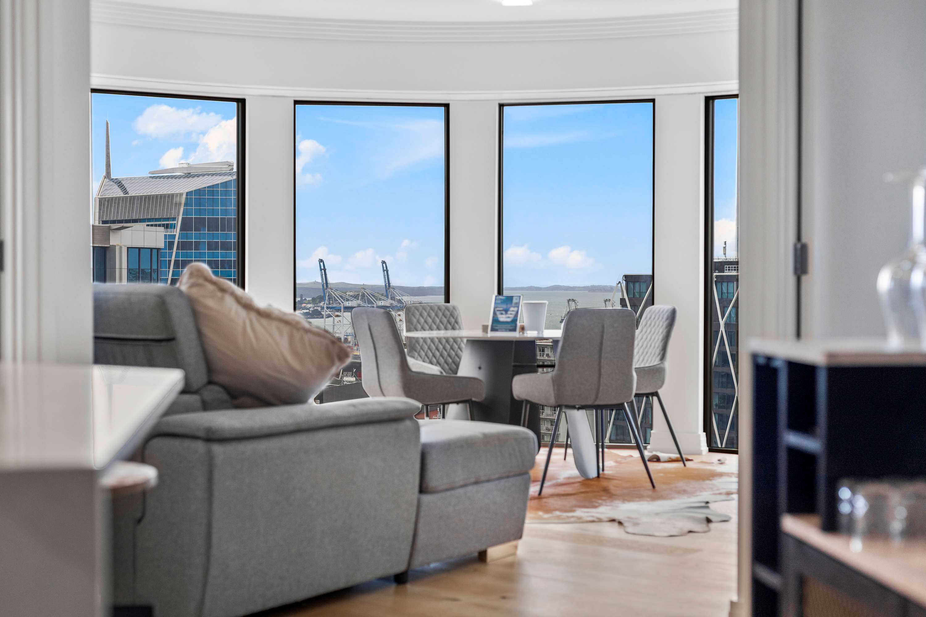 Enjoy a cozy night in with your favorite movies or shows on the Smart TV, or simply sit back and admire the view. A large floor-to-ceiling glass window floods the room with natural light and showcases stunning panoramic views of Auckland’s skyline, creating a bright and inviting atmosphere throughout the day.
