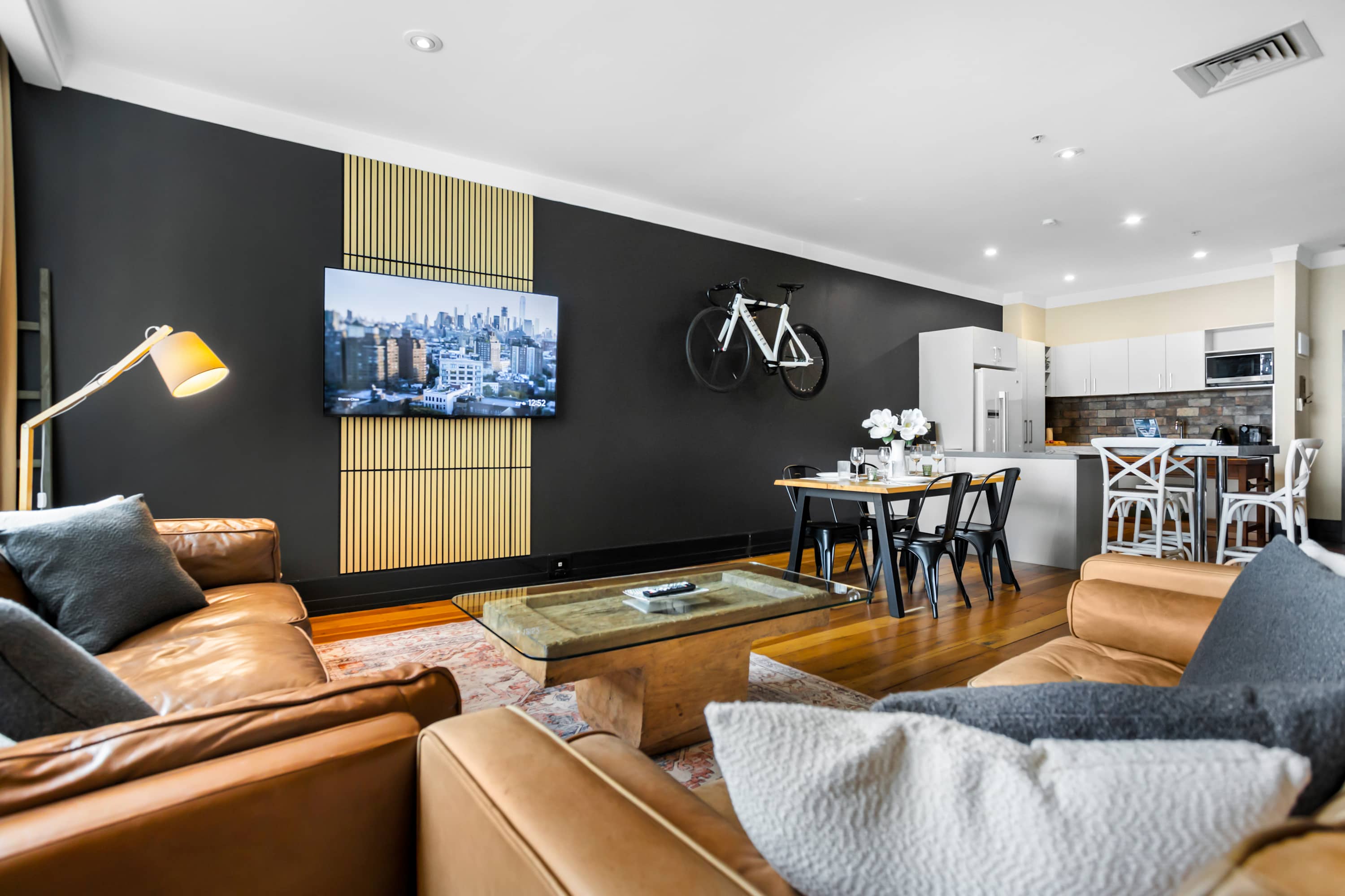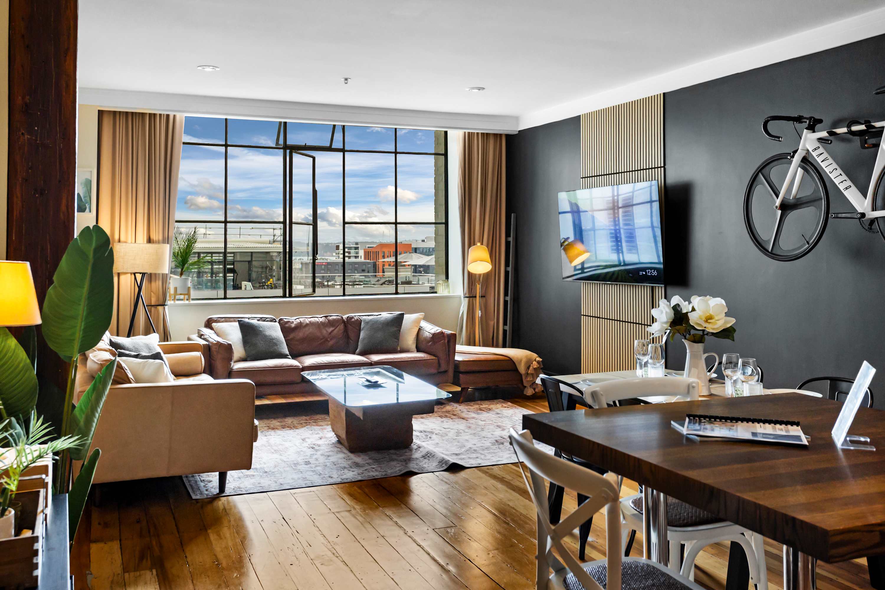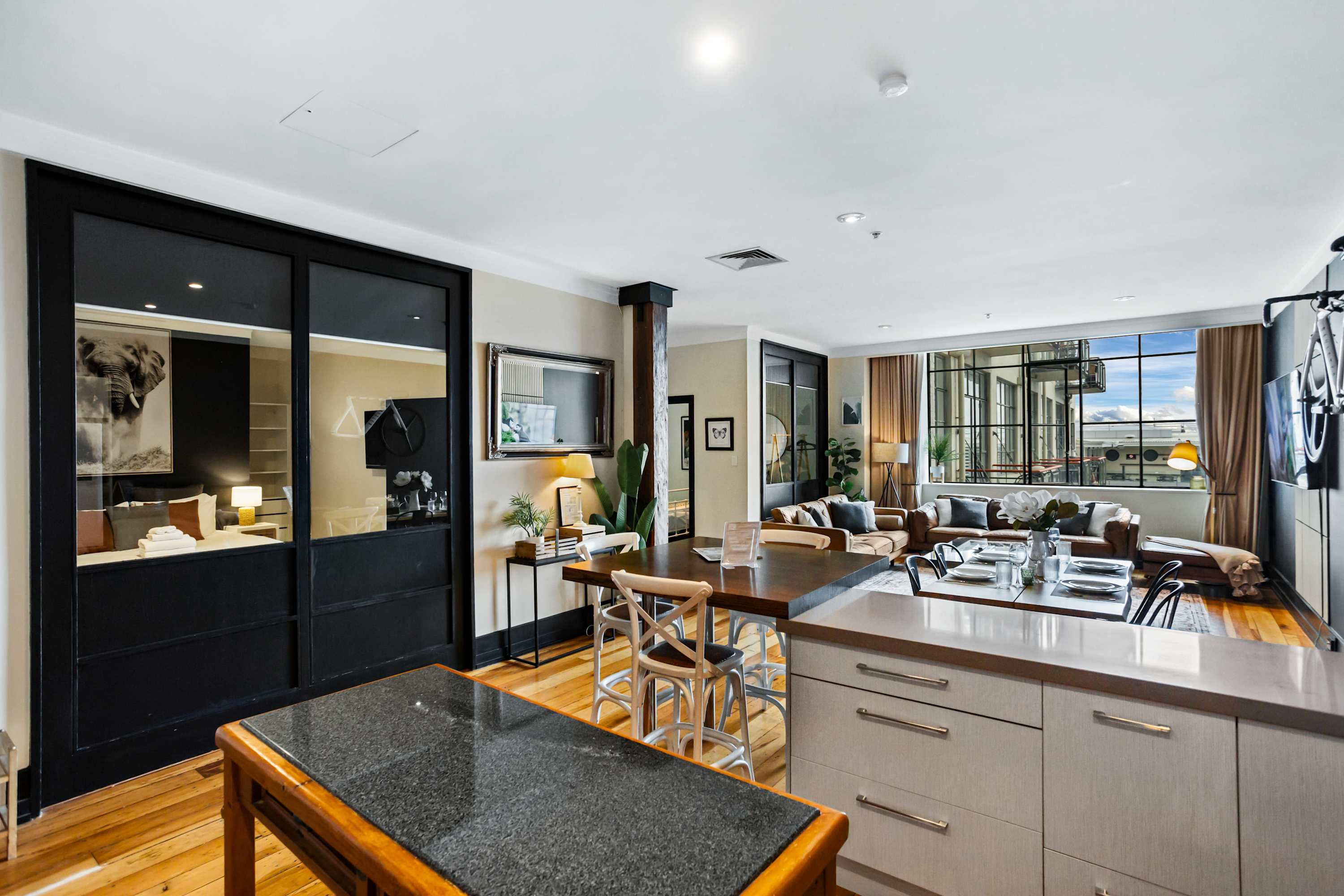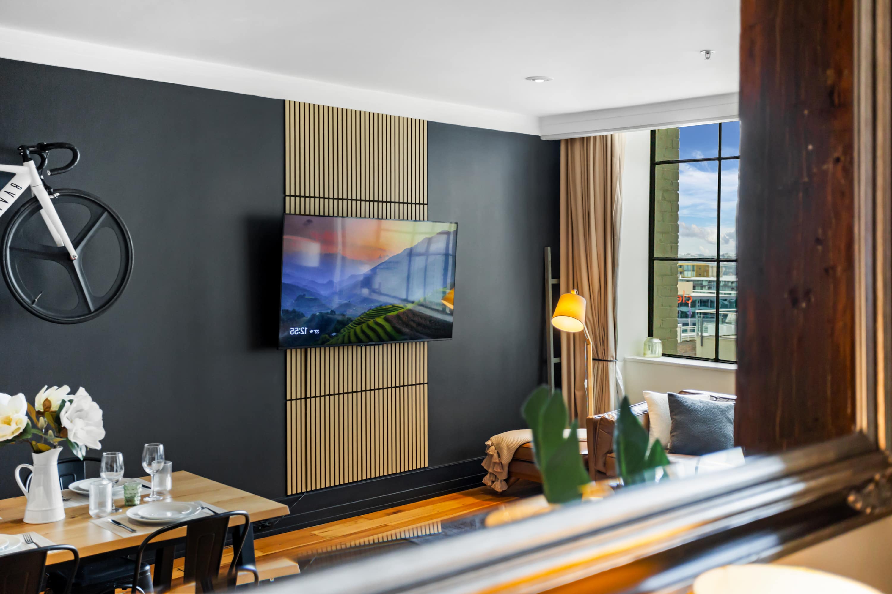 The living area features plenty of comfy seating and a large industrial-style windows fill the space with natural light and offer sweeping urban views. Enjoy entertainment on the TV equipped with Amazon Fire TV.