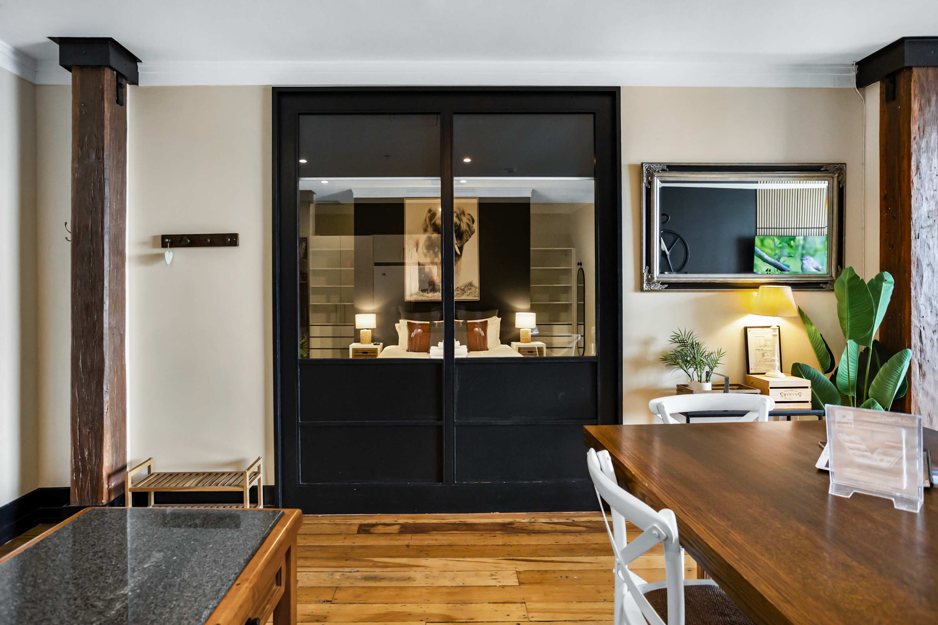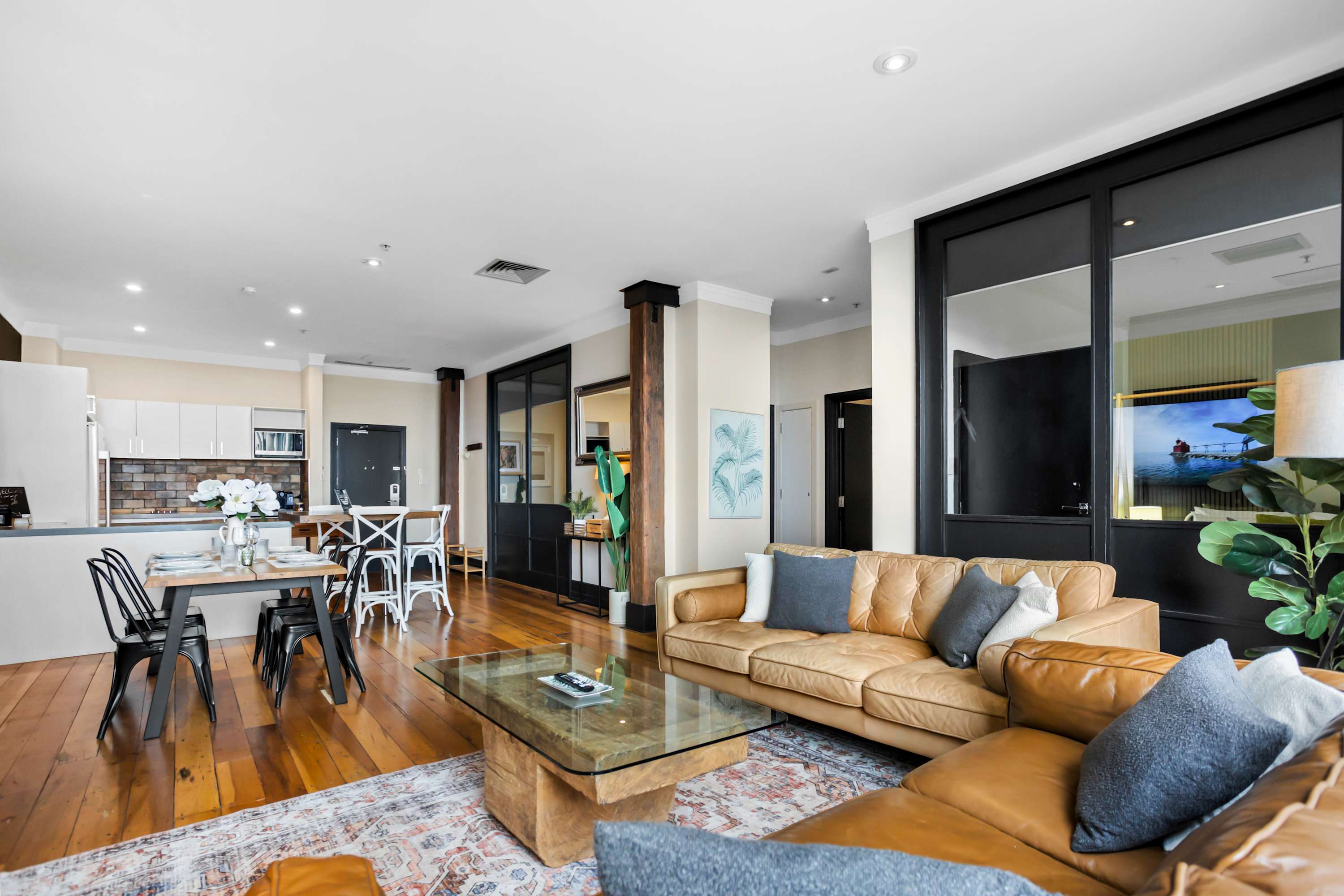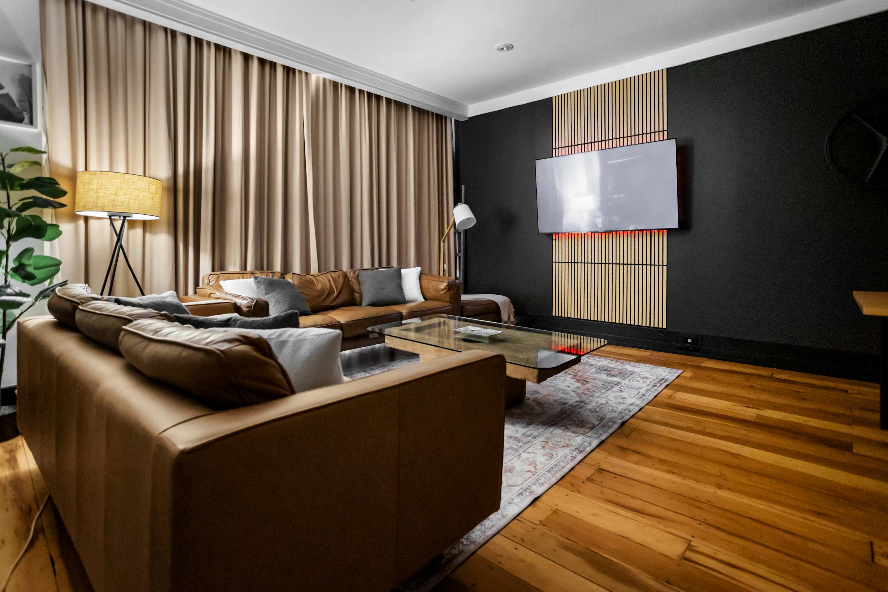 The living area features plenty of comfy seating and a large industrial-style windows fill the space with natural light and offer sweeping urban views. Enjoy entertainment on the TV equipped with Amazon Fire TV.