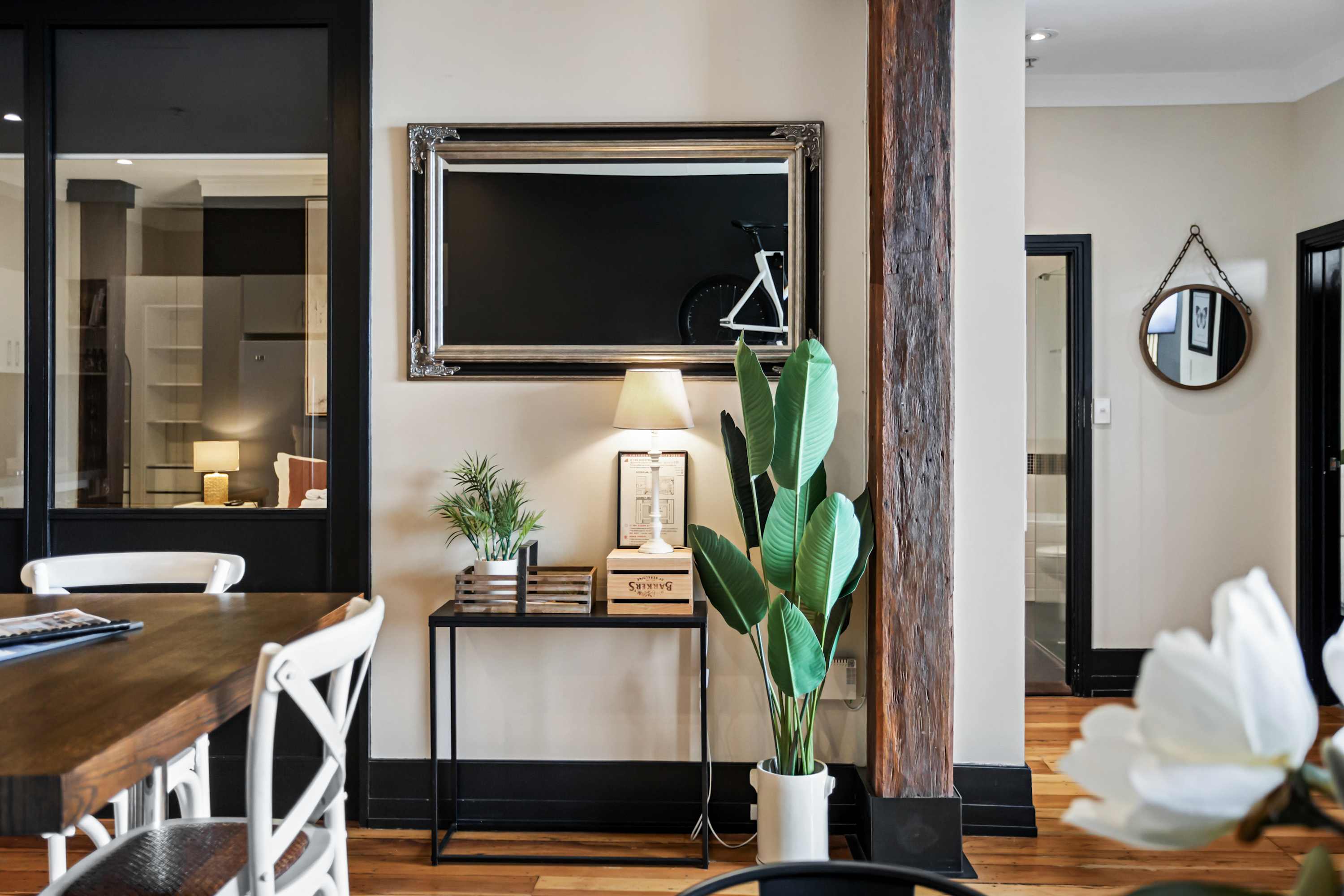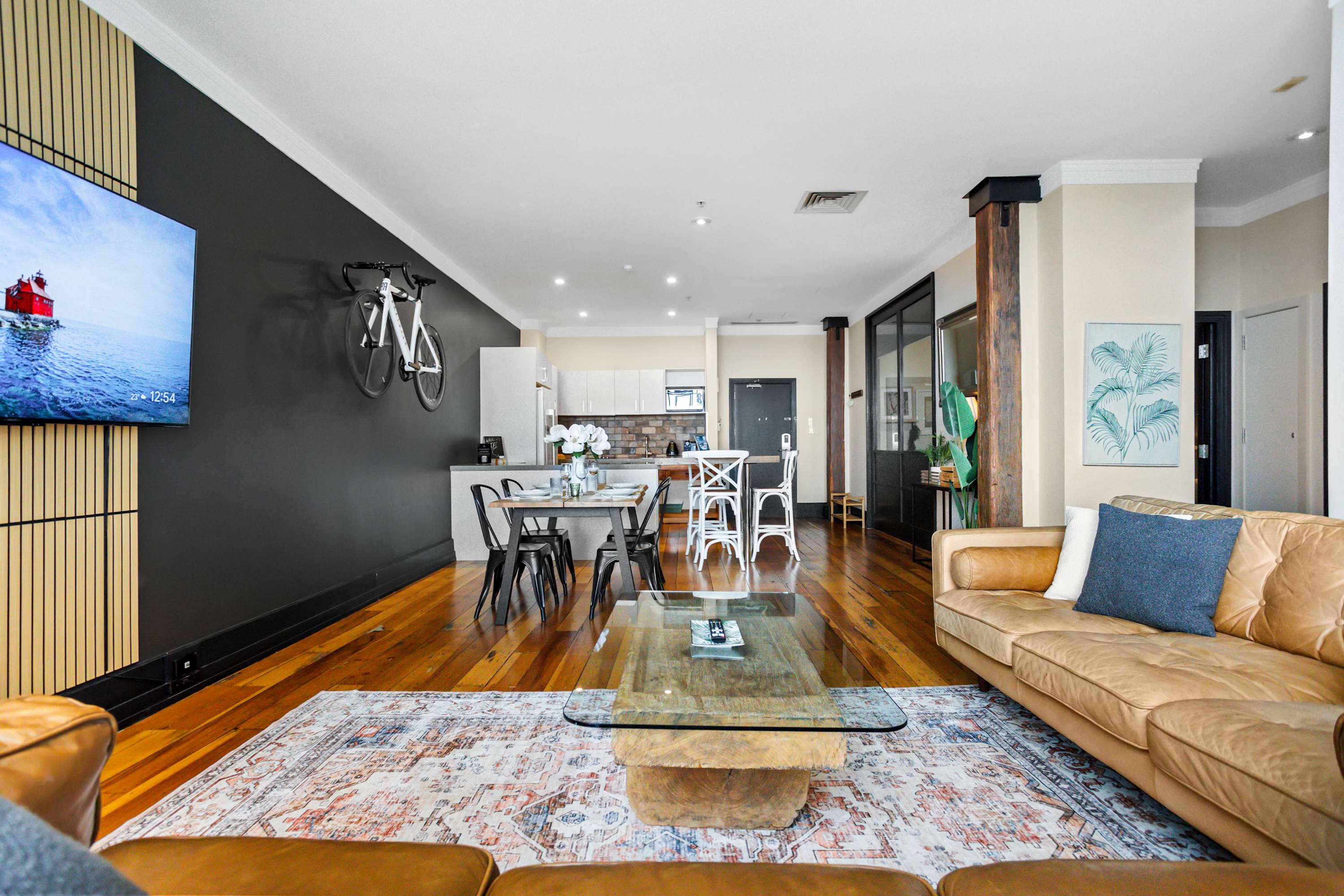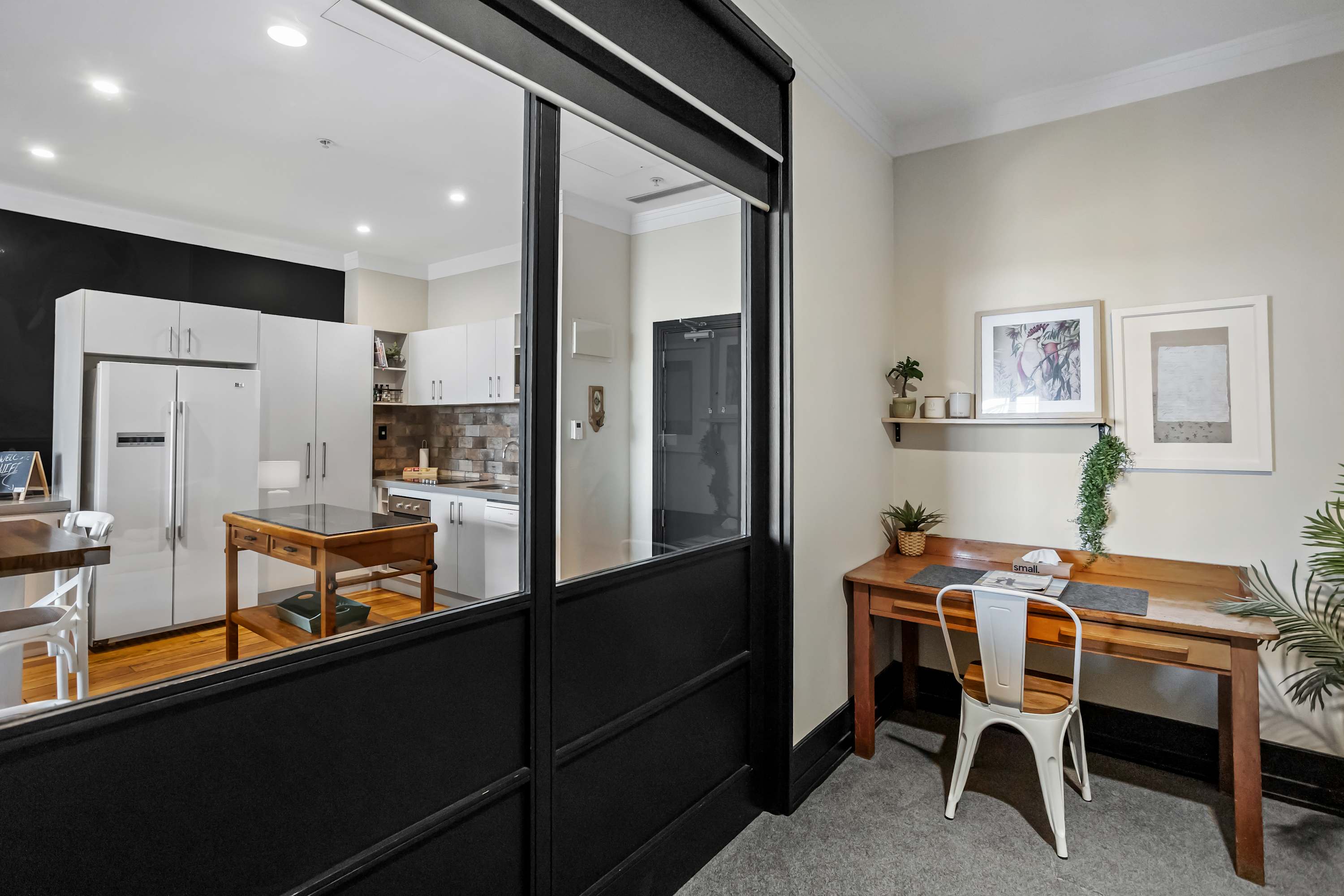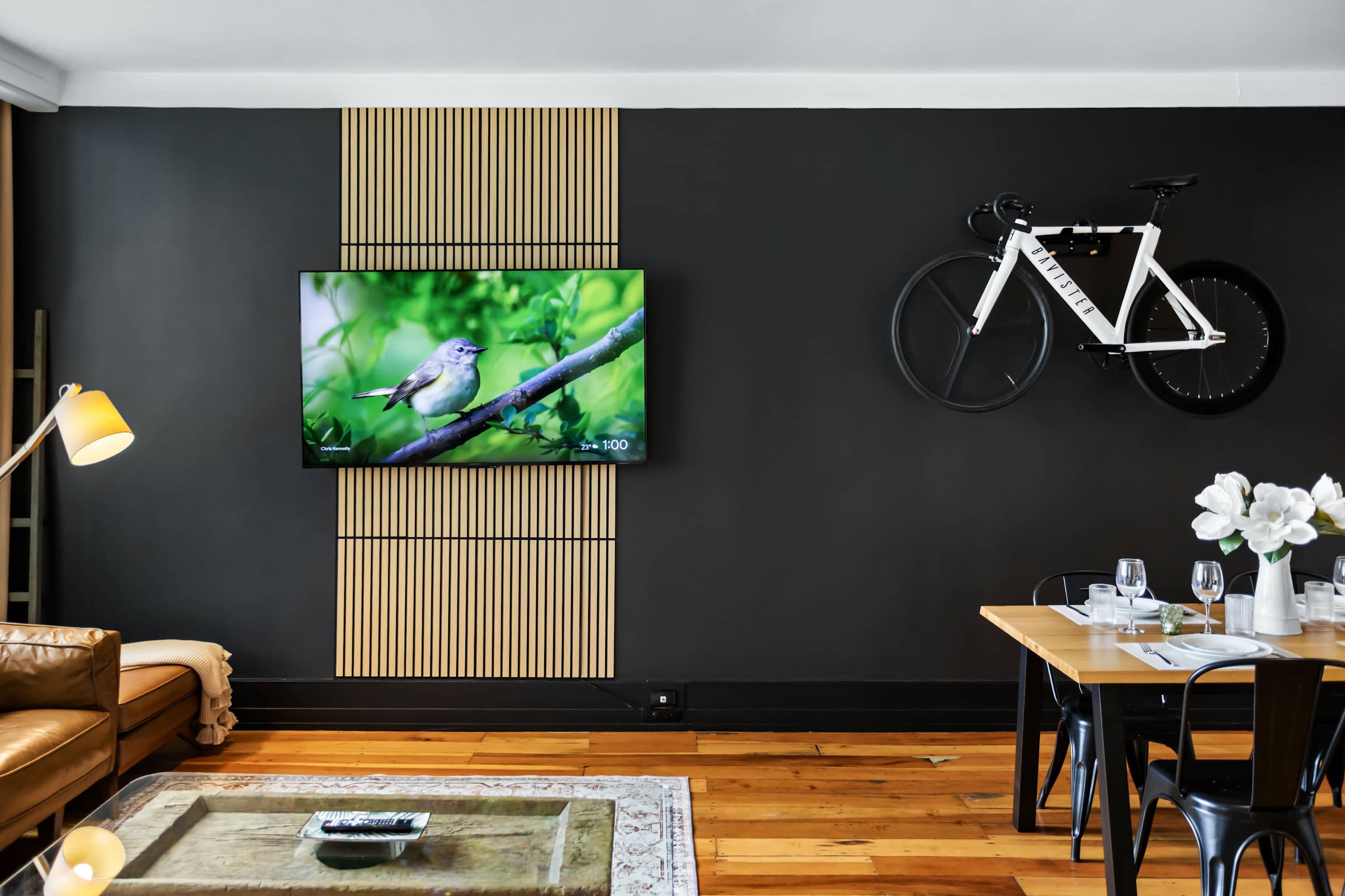 The living area features plenty of comfy seating and a large industrial-style windows fill the space with natural light and offer sweeping urban views. Enjoy entertainment on the TV equipped with Amazon Fire TV.